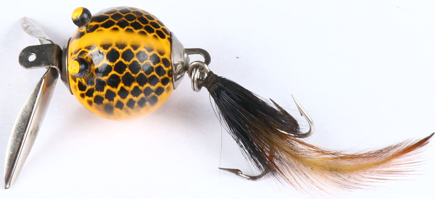 Worth Bait Co. Flutter Fin wood lure, PE, yellow with black spots, has feather skirt & two front spinners. Grade: Excellent - Value: 10 to 50