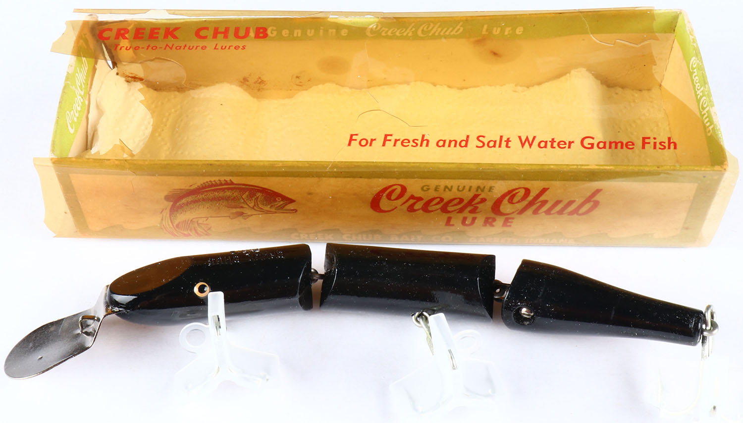 Creek Chub Double Jointed Pikie wood lure in original box, black finish, GE, 3 hook, box is soiled. Grade: Excellent - Value: 10 to 60