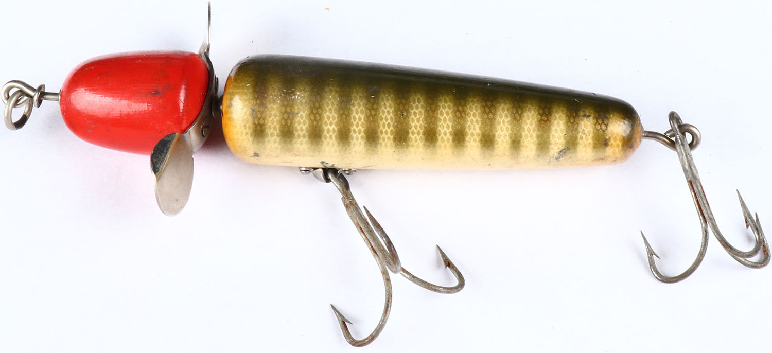 Pflueger Globe, 2 Hook Lure, no eyes, bull dog logo on spinner, 5 1/2'', surface rig, red head with pike finish body. Grade: Excellent - Value: 10 to 60
