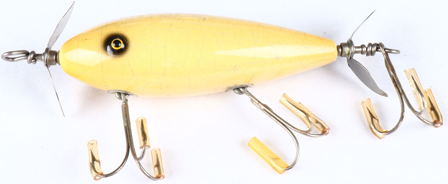 South Bend Surf Oreno, TE, all white finish with some crazing, wonderful early all white lure. Grade: Excellent - Value: 50 to 250