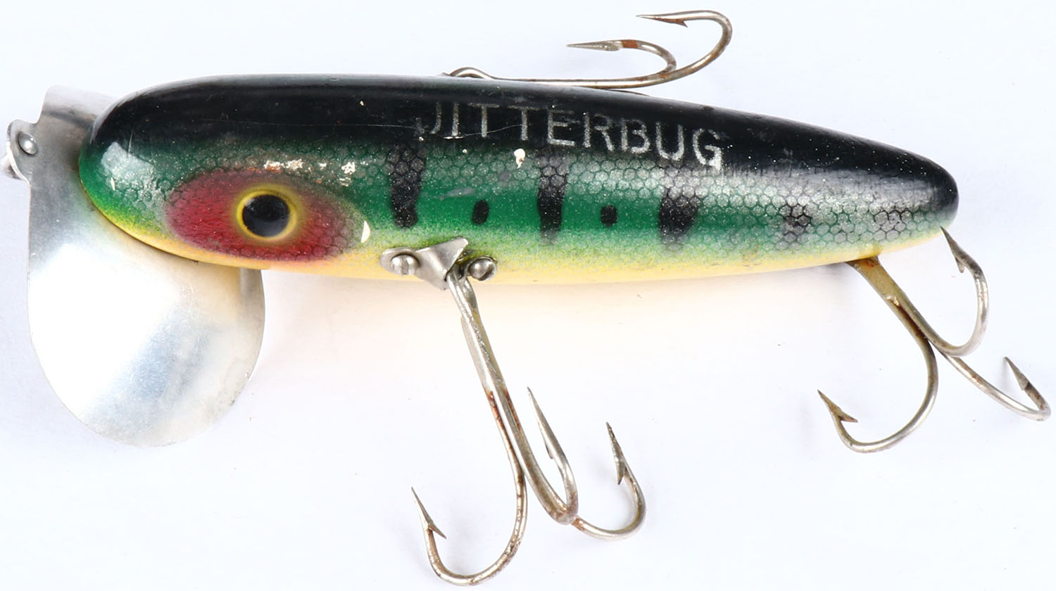 Fred Arbogast Jitterbug, green frog pattern with yellow belly, CE 3 hooks. Grade: Excellent - Value: 10 to 60