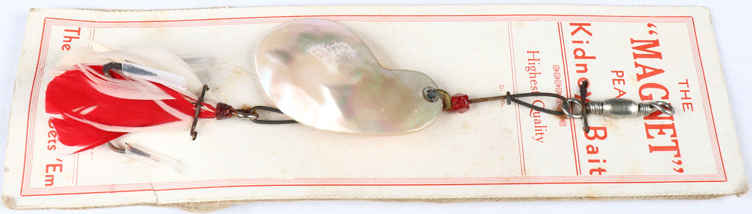 | The MAGNET Pearl Kidney Bait on card, has feather skirt. Grade:...