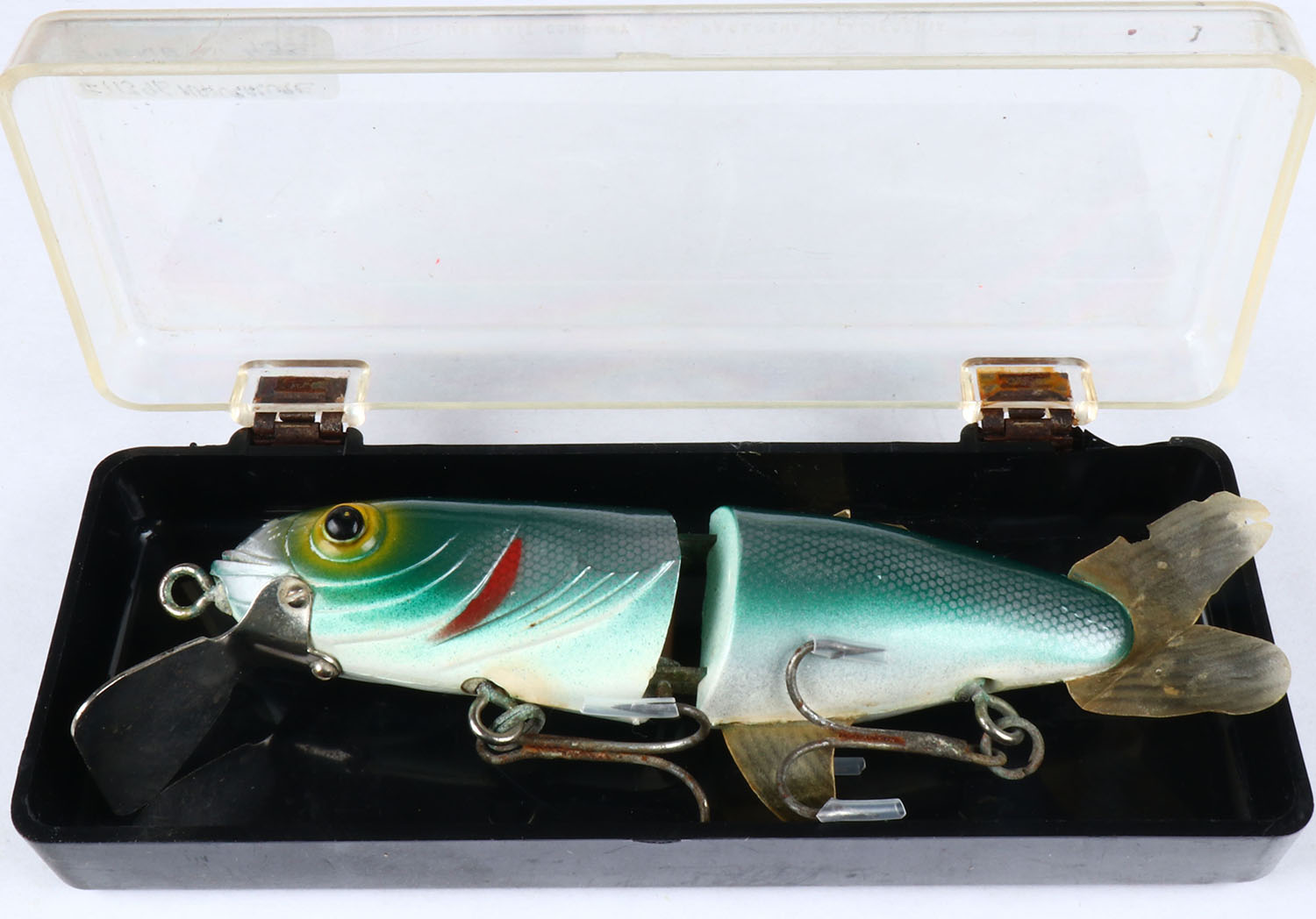 Natural lure bait co., Jointed Strikie Minnow lure in the original box, green scale, PE, metal lip, 2 hooks. Grade: Excellent - Value: 10 to 40