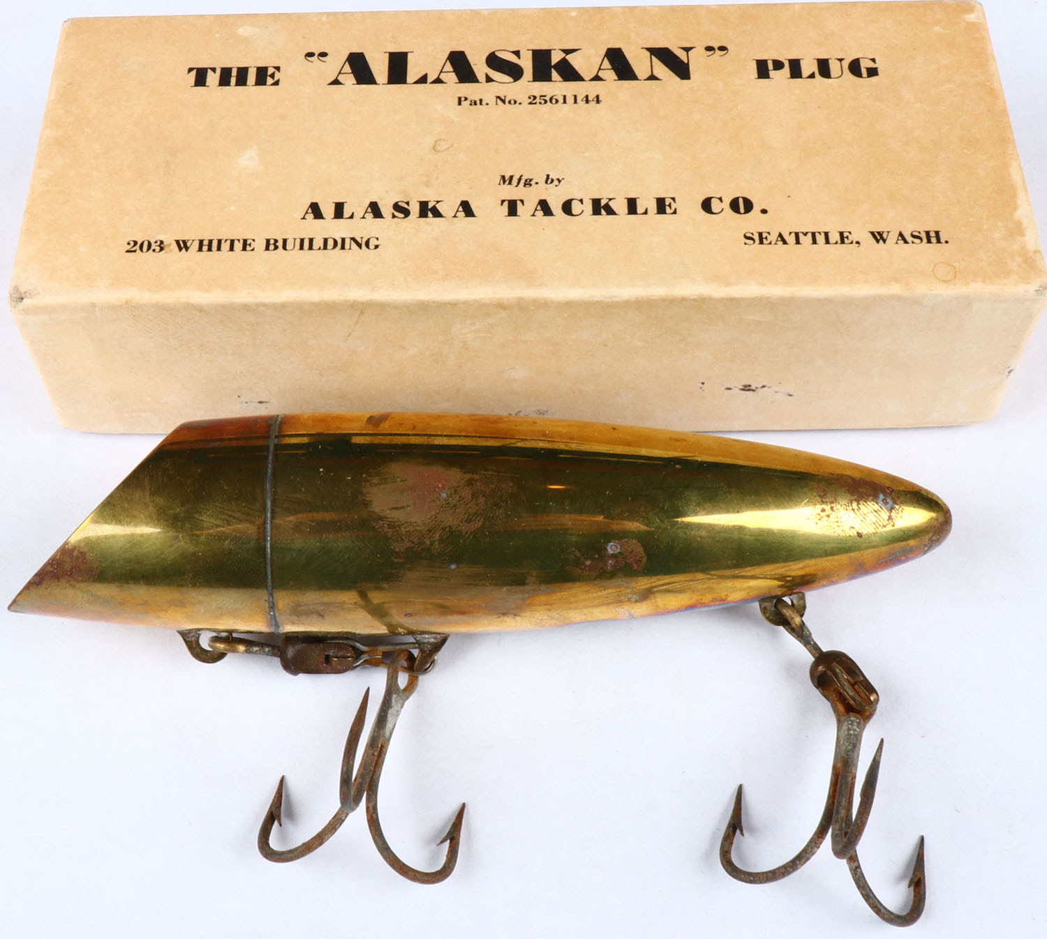 Alaskan Salmon Plug in original box, no eyes, BRASS finish. Grade: Excellent ++ - Value: 10 to 40