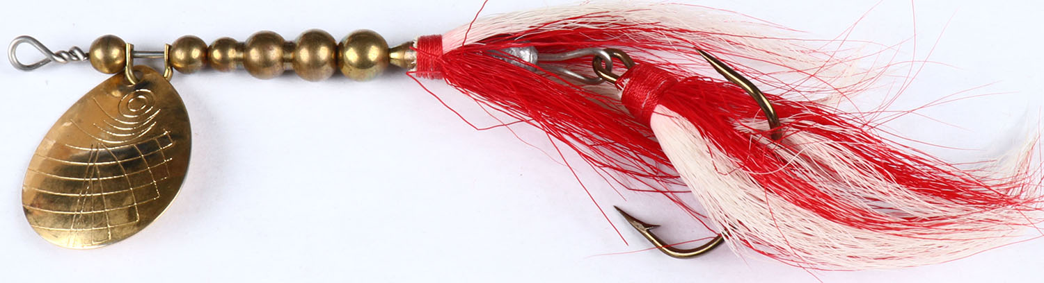 Large brass spinner with feather skirt, 5''. Grade: Excellent - Value: 2 to 30