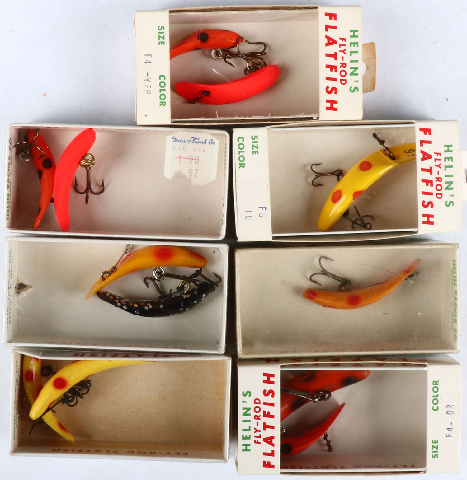 Lot of 7 Flat Fish lures in the boxes. Grade: MINT - Value: 10 to 60