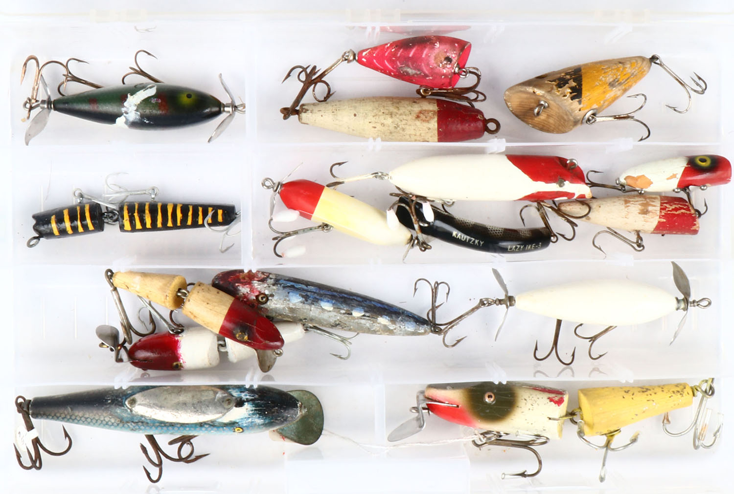 Large lot of vintage fishing lures. Grade: Very Good + - Value: 40 to 80
