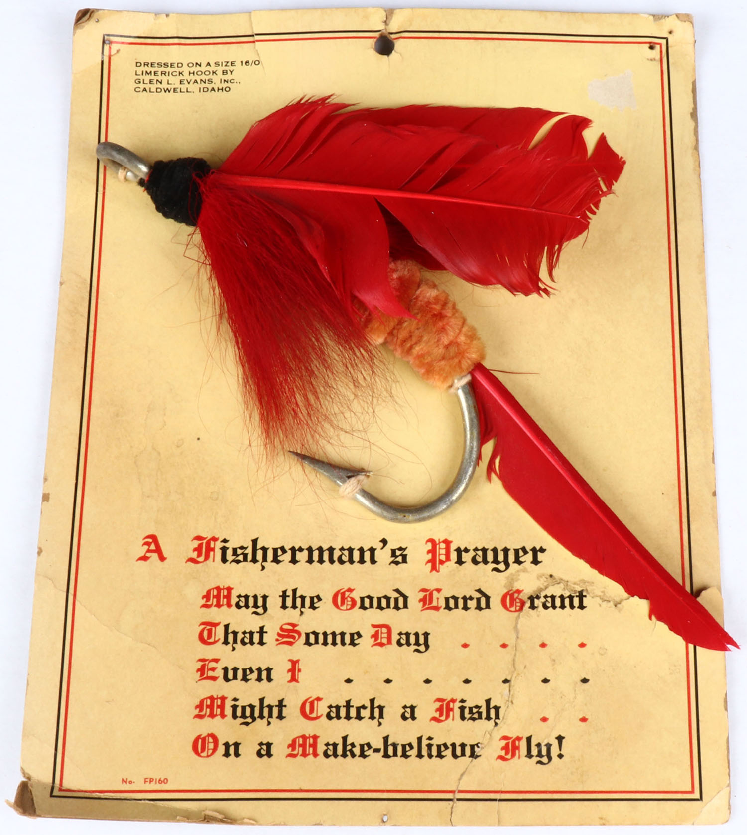 A Fisherman's Prayer, May the god lord grant that some day even I might catch a fish on a make-believe fly. Dressed on a size 16/0 Limerick hook by Glen L Evens Inc. Caldwell, ID, 8'' x 10'', card shows some damage to bottom right. Grade: Very Good - Value: 6 to 30