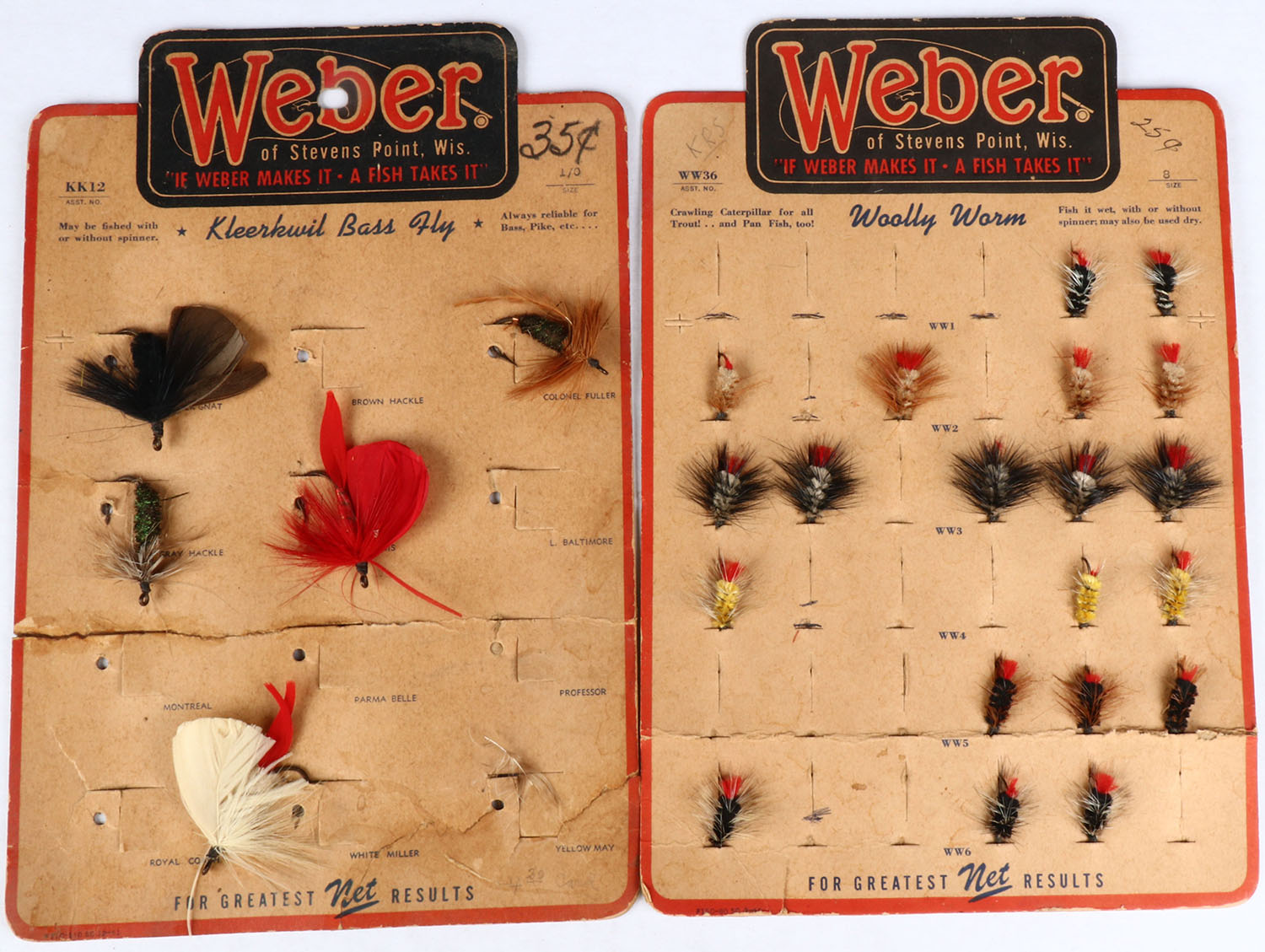 Lot of 2 Weber Files on display card, Kleerkwil Bass Fly & Willy Warm. Grade: Very Good ++ - Value: 10 to 60