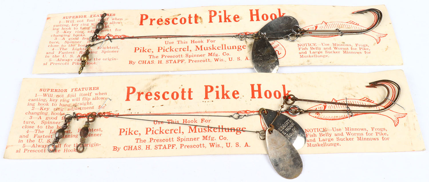 Lot of 2 Prescott Pike Hook Spinners on card, 8'' long. Grade: Excellent - Value: 6 to 30