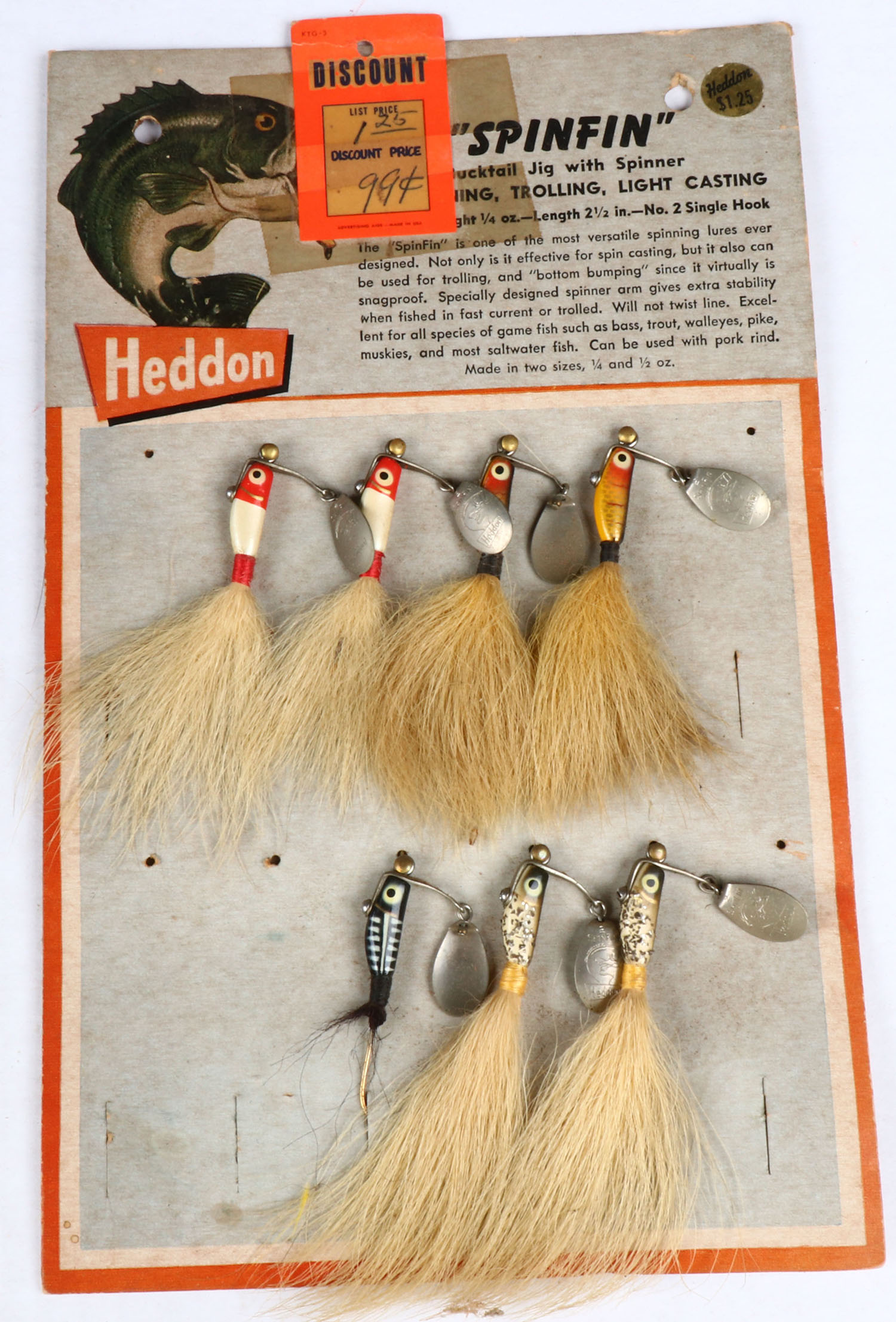Heddon Spinfin lures on display card, seven left on card in four different colors. Grade: Excellent - Value: 10 to 100