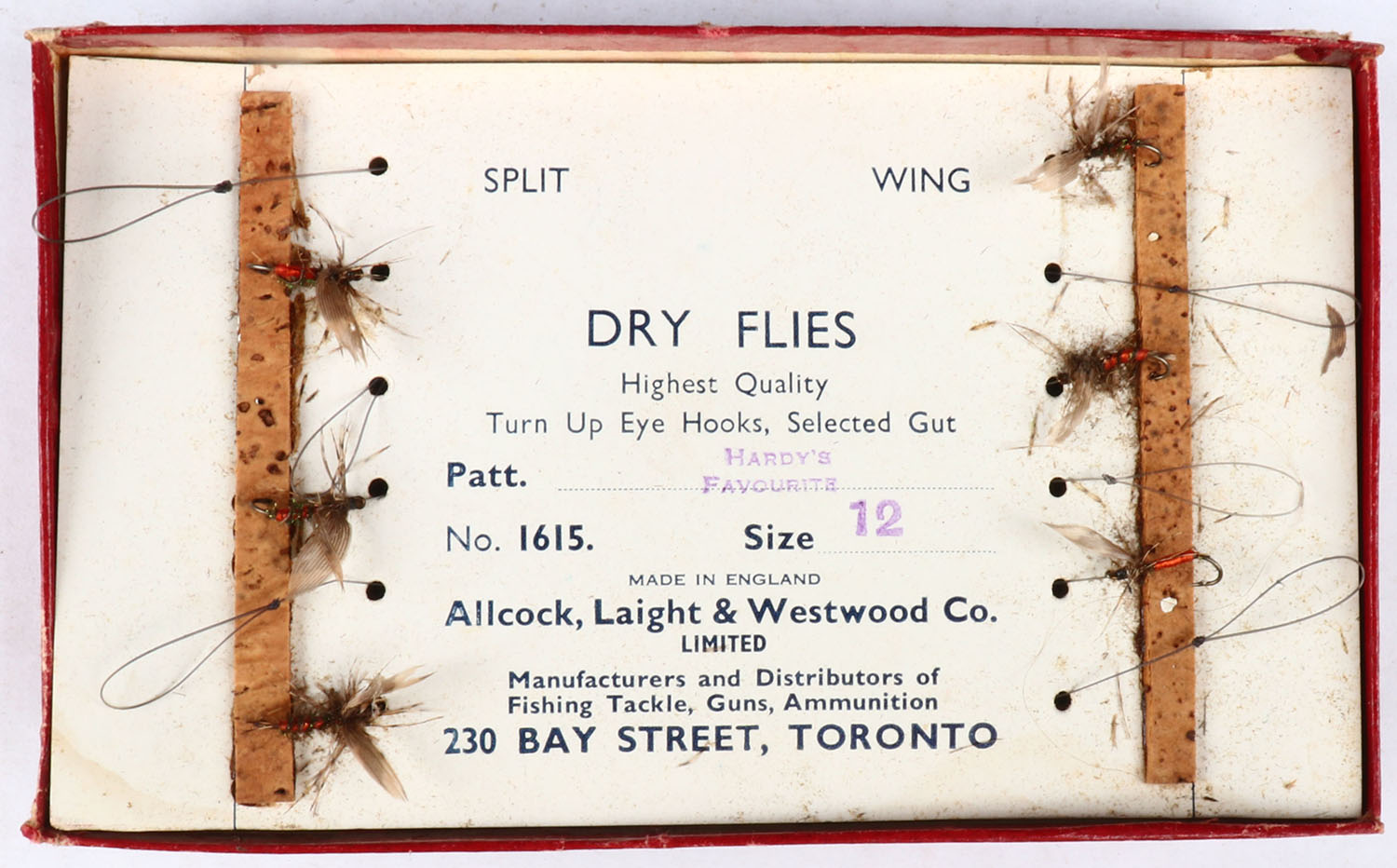 Box of Allcock, Laight & Westwood Co. Dry Flies on cards, Split Wing, has 6 per card & three cards total, the bottom two cards have nothing left of the flies & the top card shows damaged flies, marked Hardy's Favorite No. 1615 Size 12. Grade: Good - Value: 2 to 30