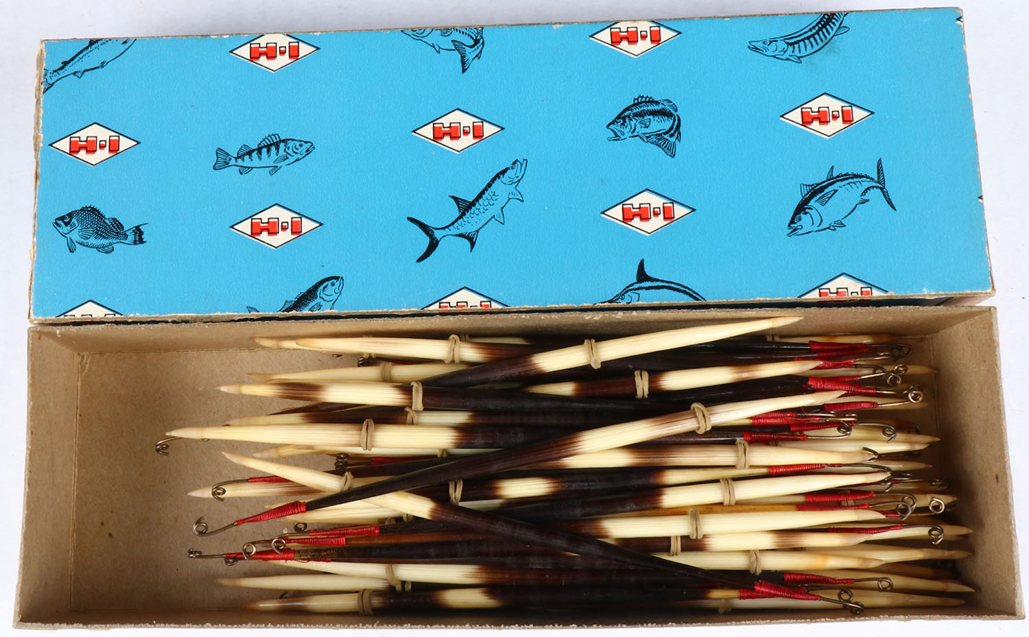 Rare full box of 72 Porcupine Quill Floats or bobbers by H-I, box is marked on end label. Grade: Excellent - Value: 50 to 300