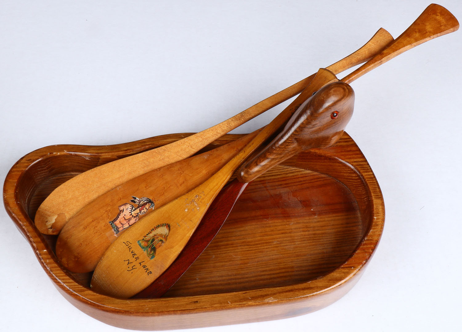 Lot of 4 Salesman Sample canoe paddles & a duck wood tray, paddles are marked Canadian Outboard boat & Canoes (12''), Silver Lake NY (12''), Rochester, NH (16'') and an image of a native american (18''). Grade: Excellent - Value: 20 to 200