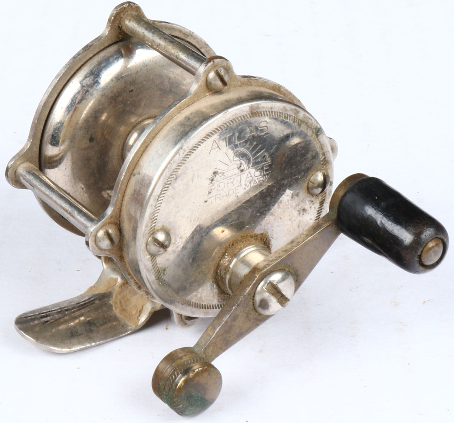 Atlas Portage small reel, 40yds, single black wood handle, works well. Grade: Excellent - Value: 10 to 40