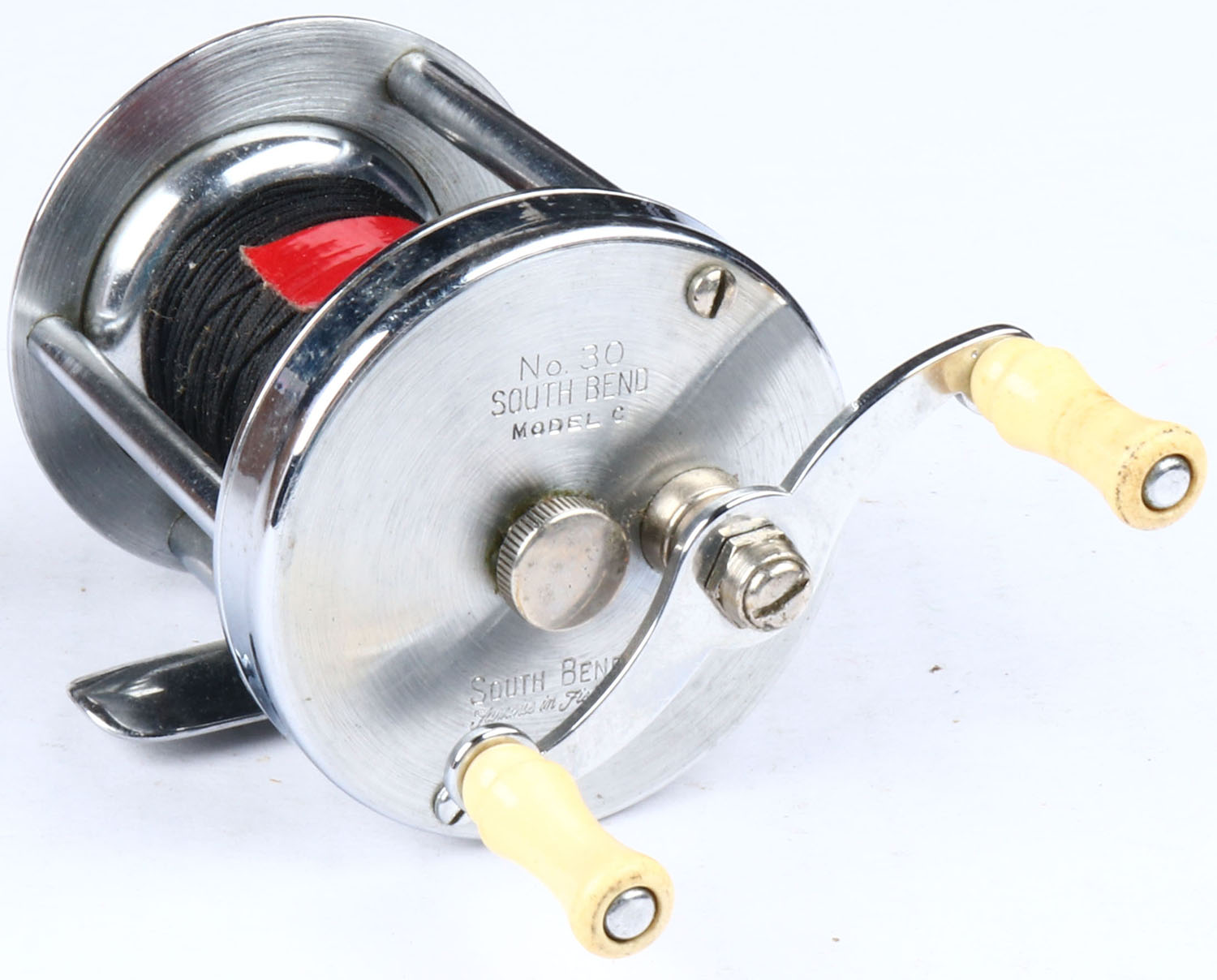 South Bend level wind reel, No. 30 Model C, dual white handle, strong click, spins well. Grade: Excellent - Value: 10 to 30