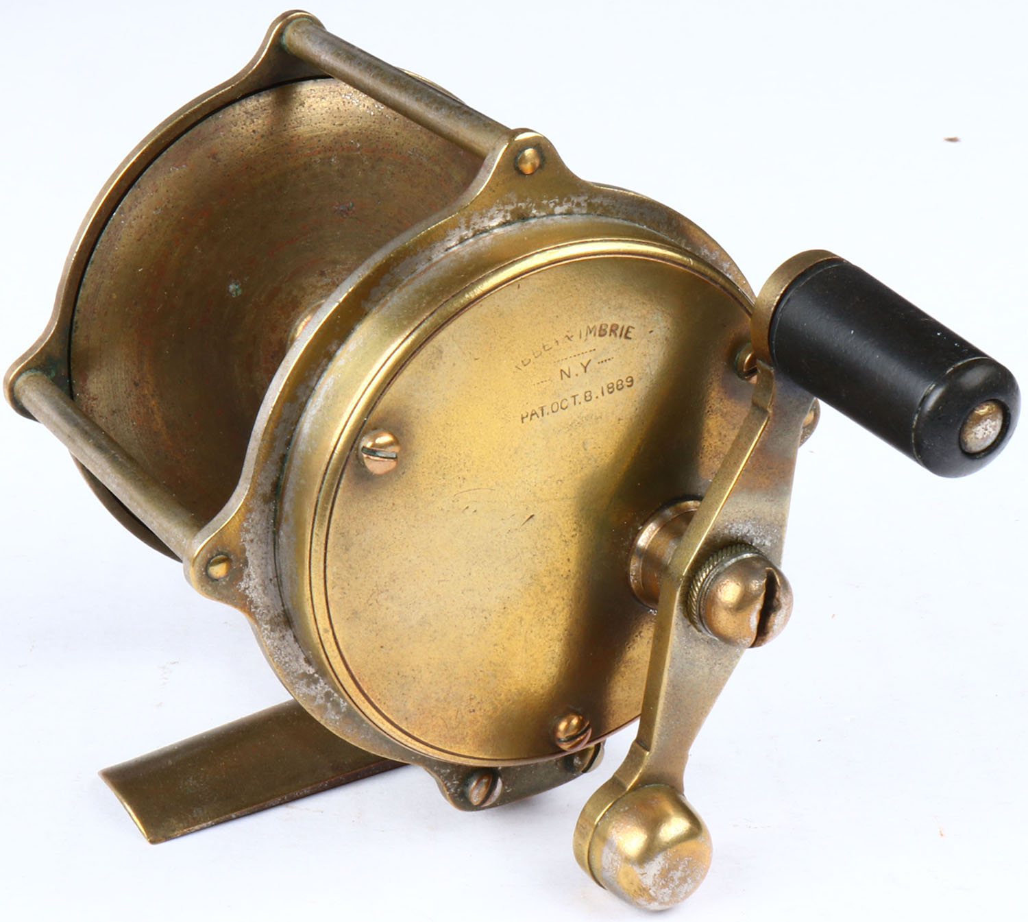 Abbey & Imbrie NY brass reel, pat Oct 1889, black wood single handle, reel seat marked 1/0. Grade: Excellent - Value: 20 to 100