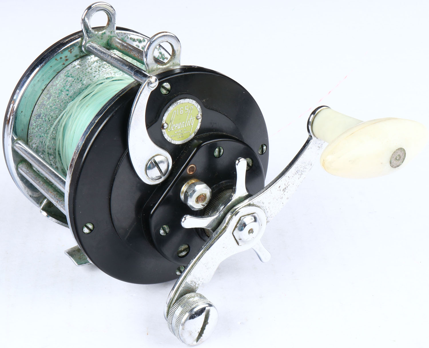 Ocean City No. 165 surf casting reel, single white handle. Grade: Excellent - Value: 6 to 30