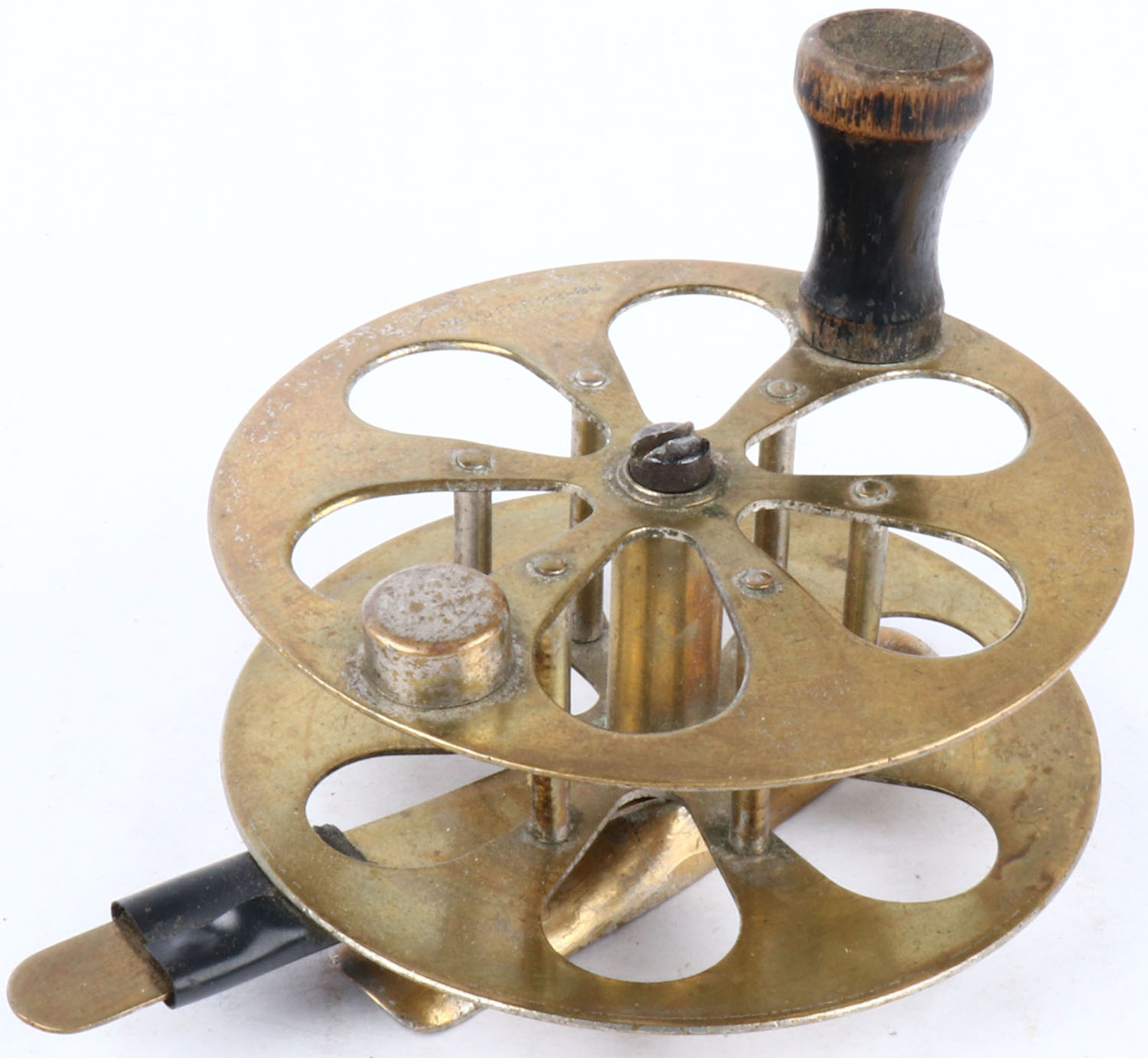 | Early brass fly reel pat. Feb. 1886, 1889. 3'' dia, has brass ...