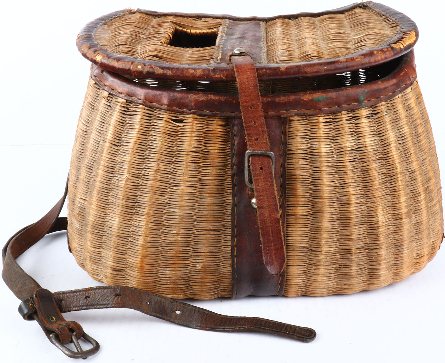 Vintage fishing creel with leather, top leather strap is intact, carrying loop on back is gone, has part of shoulder harness, 14'' base. Grade: Very Good ++ - Value: 10 to 60