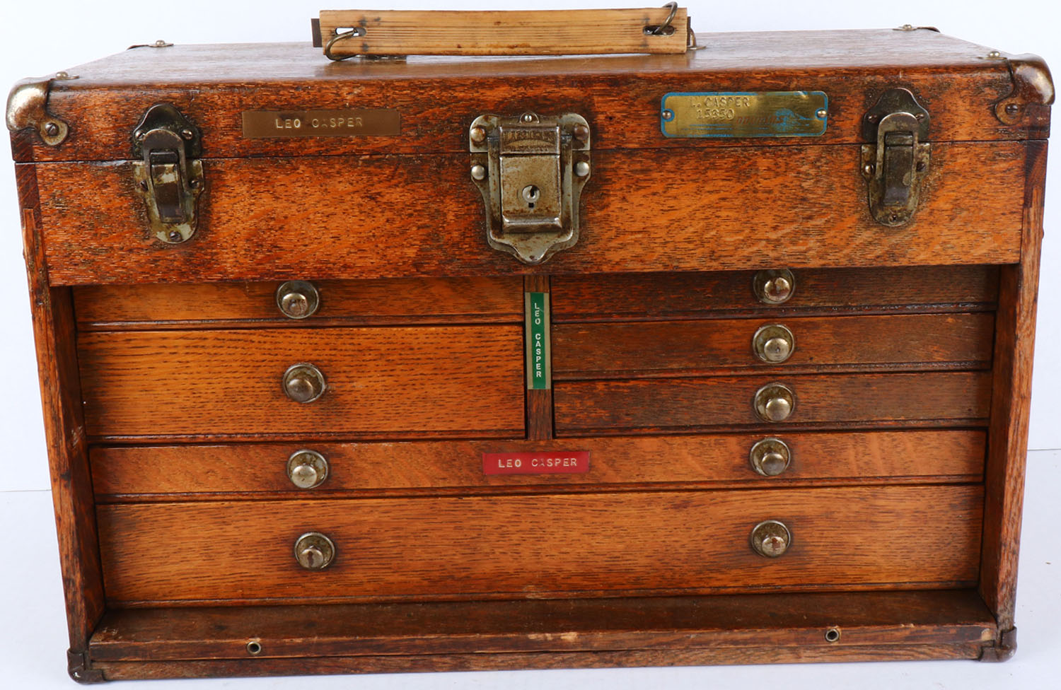 Vintage Union Steel Chest Corp wood tackle box with 7 pull out drawers on bottom & storage on top with mirror under lid, leather handle is inside & replaced with make shift handle, 20'' x 12'' x 8''. Grade: Excellent - Value: 20 to 100