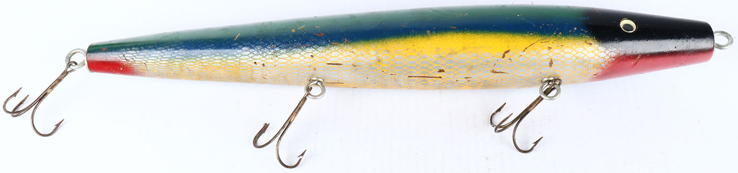 Large Wood Fishing lure, possible marlin lure, 25'', green, blue with yellow scale belly, 3 hooks, GE, shows some hook dings. Grade: Very Good ++ - Value: 10 to 250