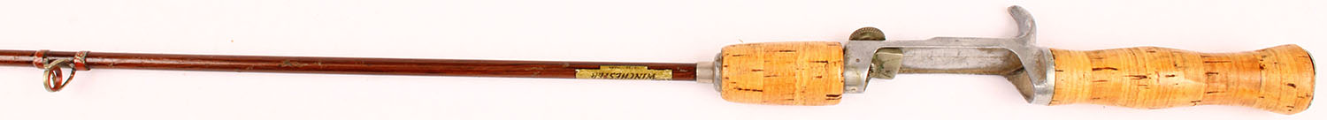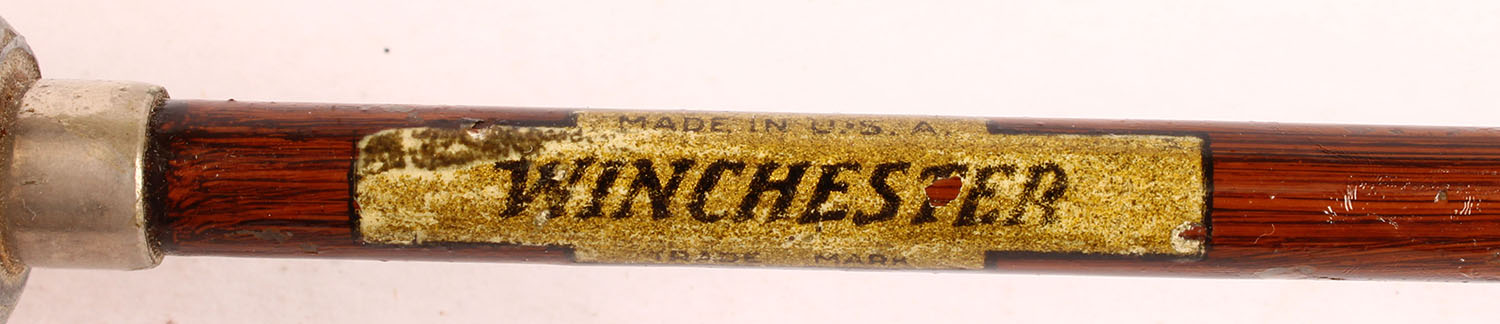 Winchester 3pc. Wood grain steel casting rod No. none, 4 1/2', all orginal and correct length, cork handle is excellent, well marked on rod. Grade: Excellent - Value: 20 to 80
