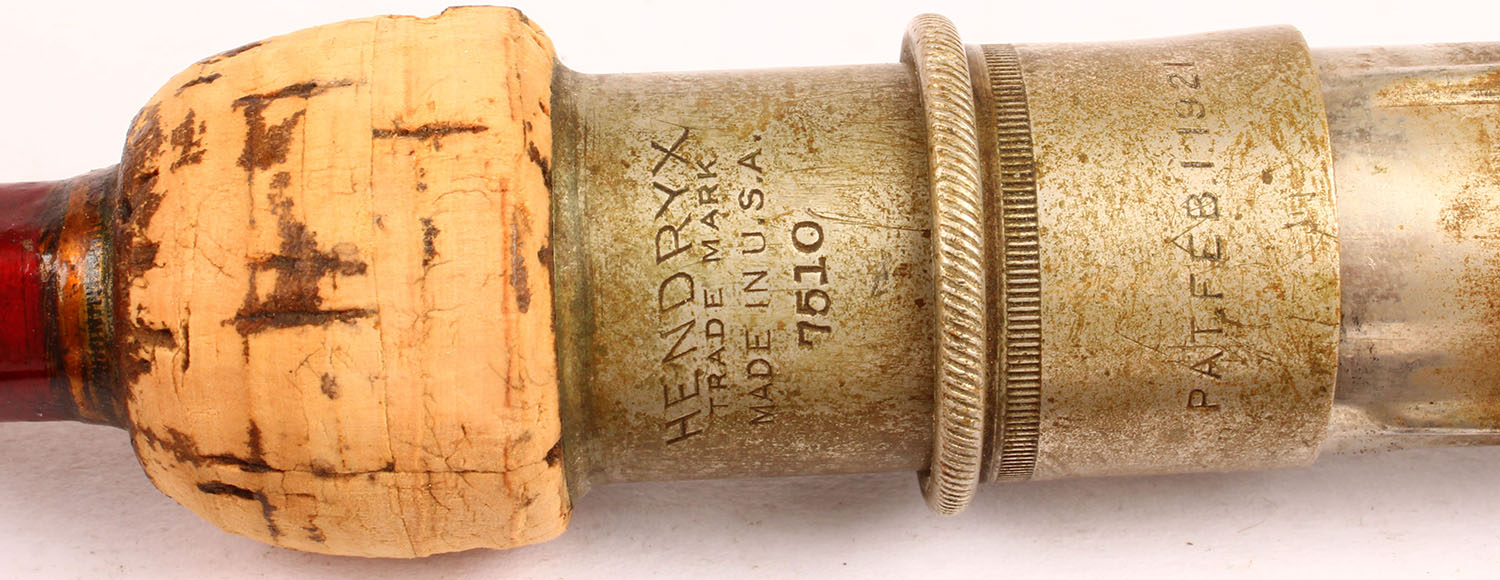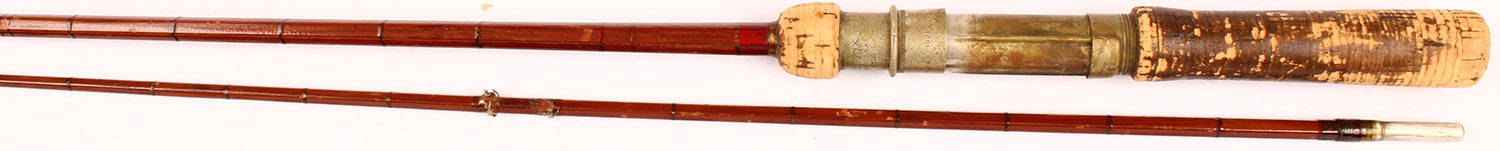 Hendryx (which is one of the MFG who made rods for Winchester) 2pc. Split bamboo casting rod No. 7510, 6', has one tip & one main section, all sections are the correct length, cork handle show wear, two guides are loose & one of them is missing, well marked on metal. Grade: Very Good - Value: 6 to 30