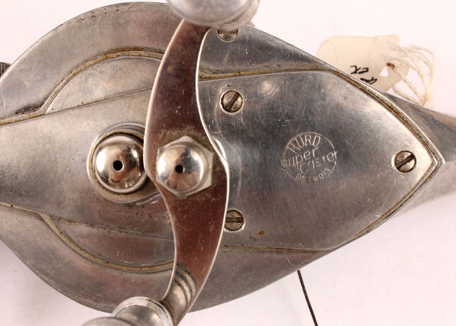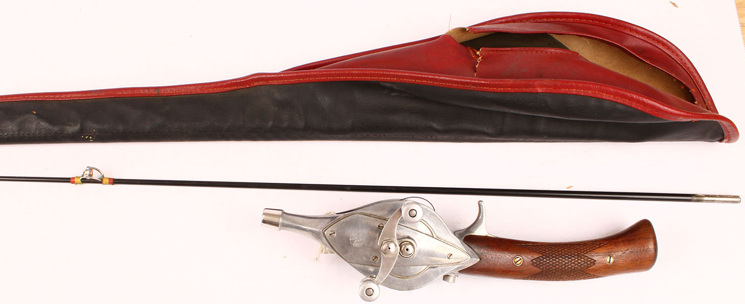 Hurd Super Caster Steel Casting Rod with walnut handles, 5', has orginal case which is torn on both side of zipper, works well, nice checkered wood grips. Grade: Excellent - Value: 50 to 200