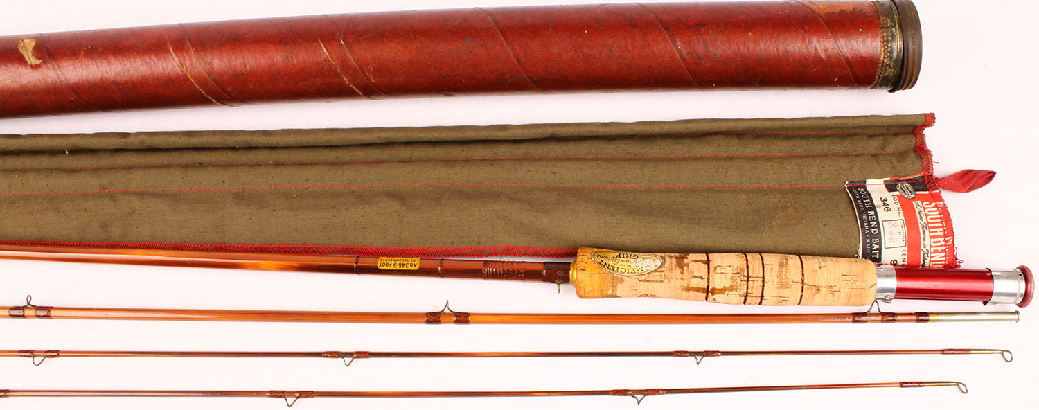 South Bend Bamboo Fly Rod No. 346-9', Line recommended D or HDH, 3/2, cork handle has orginal gold label, all sections have orginal wraps & are the same length, original cloth bag that is marked & unmarked cardboard tube. Grade: Excellent ++ - Value: 30 to 200