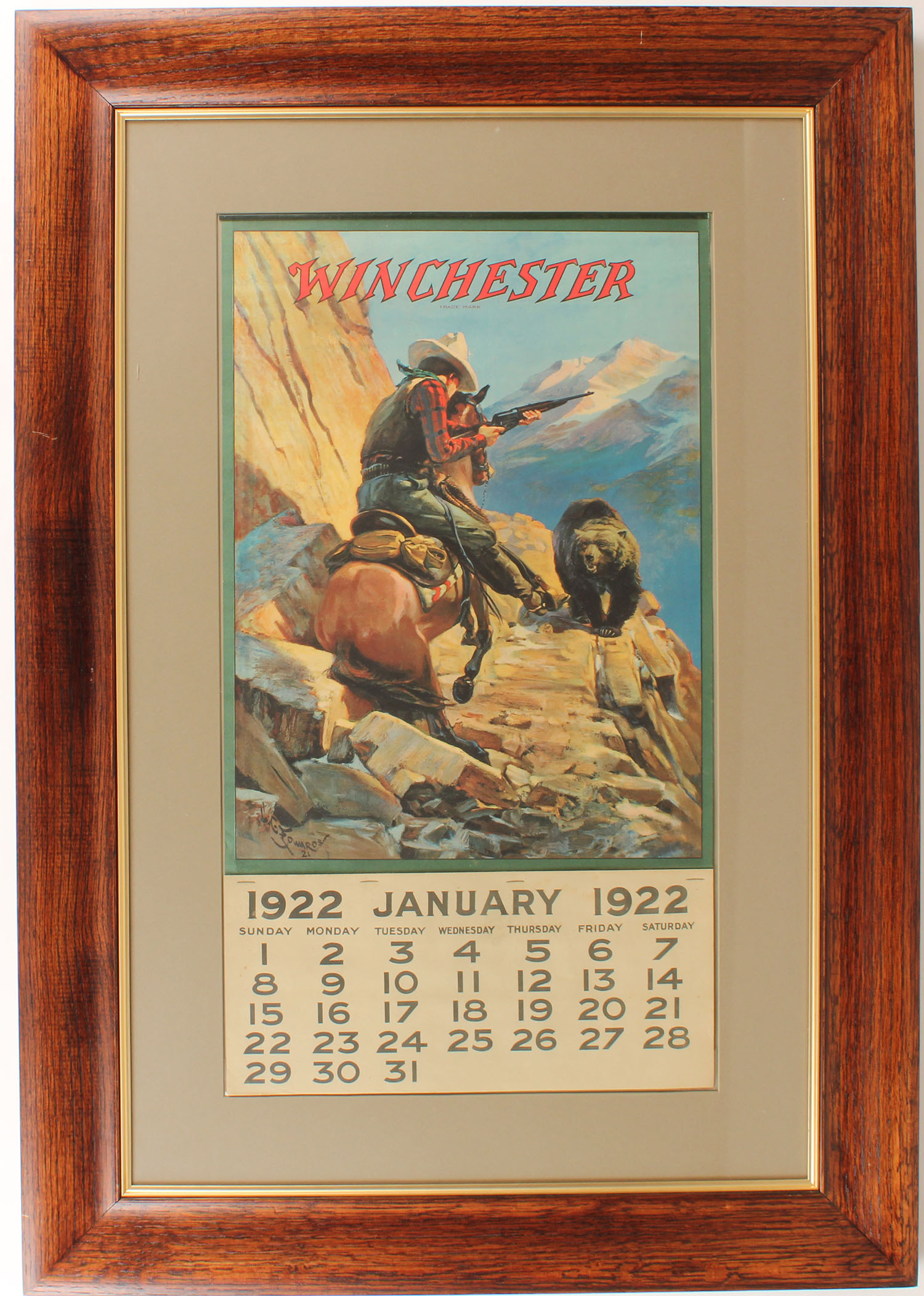 RARE 1922 Winchester Calendar, great full color image of Bear blocking the path of a hunter on horseback on side of a cliff, artist H.C. Edwards (1868-1922) in the last few years of his life, Full Pad of pages, 14 5/8'' x 26 1/8'', metal band top, calendar is almost mint condition with fantastic colors, framed & matted, Very Rare & very collectible! Grade: Excellent ++ - Value: 2000 to 4000