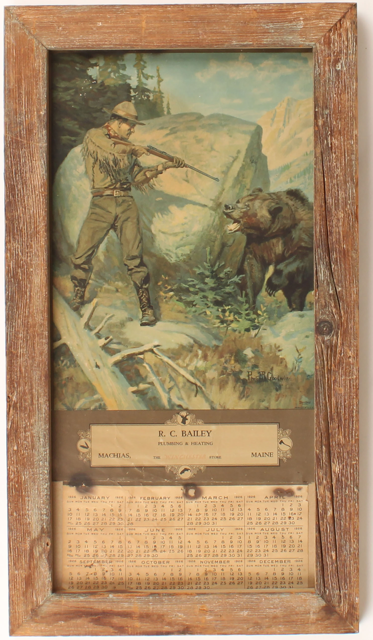 1925 Winchester Store Calendar by Philip R Goodwin, pictures hunter face to face with a grizzly bear on side of a mountain, has metal band on top, no pages, shows some age soiling, 10'' x 20''. Grade: Very Good ++ - Value: 200 to 1000