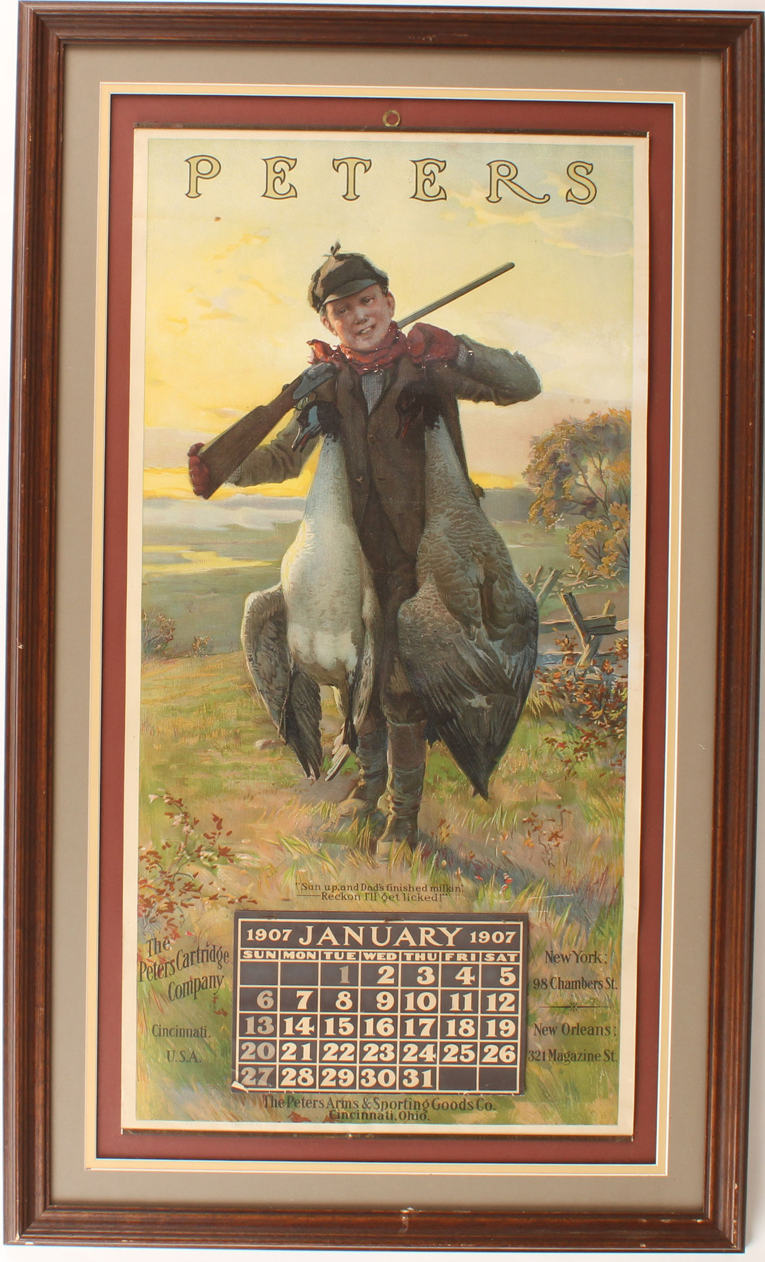 RARE 1907 Peters Calendar, ''SUN UP, AND DAD'S FINISHED MILKIN, RECON I'LL GET LICKED, Pictures boy with two geese over his shoulder & a double shotgun, brass bands top & bottom with hanger, Full Pad of Pages, 14'' x 28'', no edge wear, wonderful condition with one very small stain to top left under ''P'', also has minor scuffing to area just under his face, extremely hard to find! Grade: Excellent - Value: 4000 to 8000