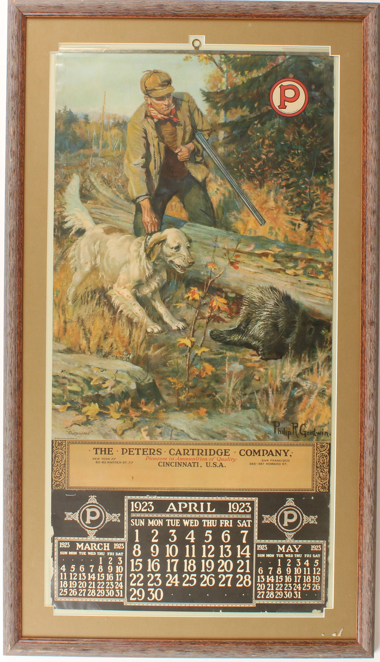 1923 Peters Calendar by Philip R. Goodwin, has great fall image of hunter holding back his dog from a Porcupine, ''OUTPOINTED'', has band on top with brass hanger, April Pages, 15'' x 30'', calendar is near mint with great colors, framed. Grade: Excellent + - Value: 1000 to 2000
