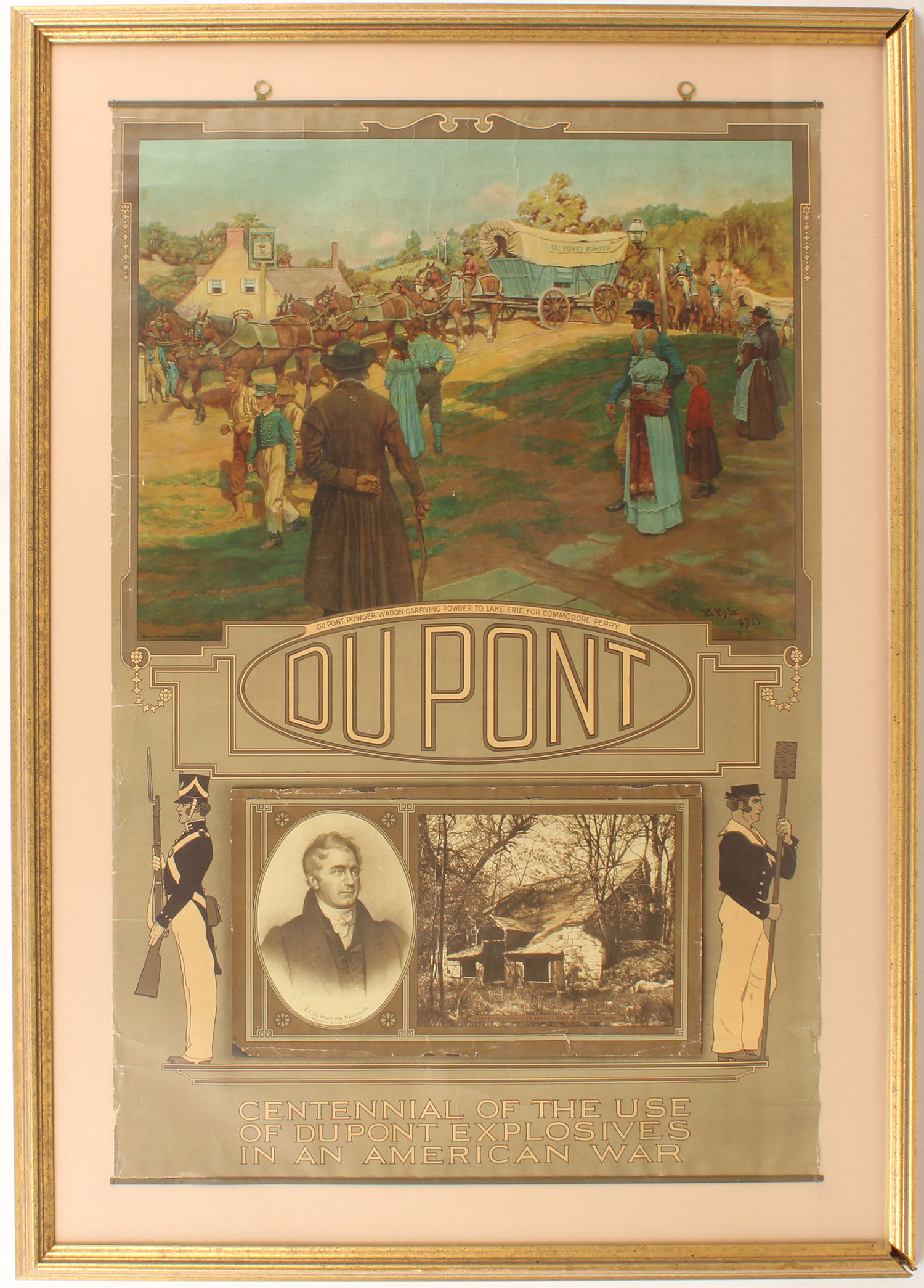 1912 DUPONT Calendar, 19th Century Horse and Wagon Gun Powder scene, wonderful colors, image size, 20'' x 30'', has metal bands top & bottom with two brass hangers, Full pad of pages with cover sheet, excellent condition except for edge wear to left side, scarce & original, artist H. Pyle, framed. Grade: Excellent - Value: 500 to 1000