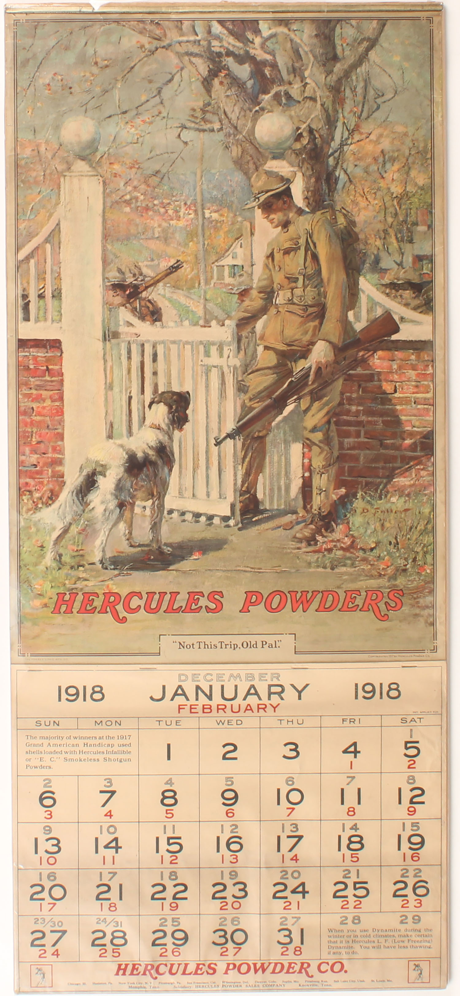 1918 Hercules Powder Co. Calendar Top, ''NOT THIS TRIP, OLD PAL'', full color image of solder headed off to war & dog wanting to go hunting, Full Pad of Pages, has brass top band & hanger, wonderful condition. Grade: Excellent + - Value: 400 to 800