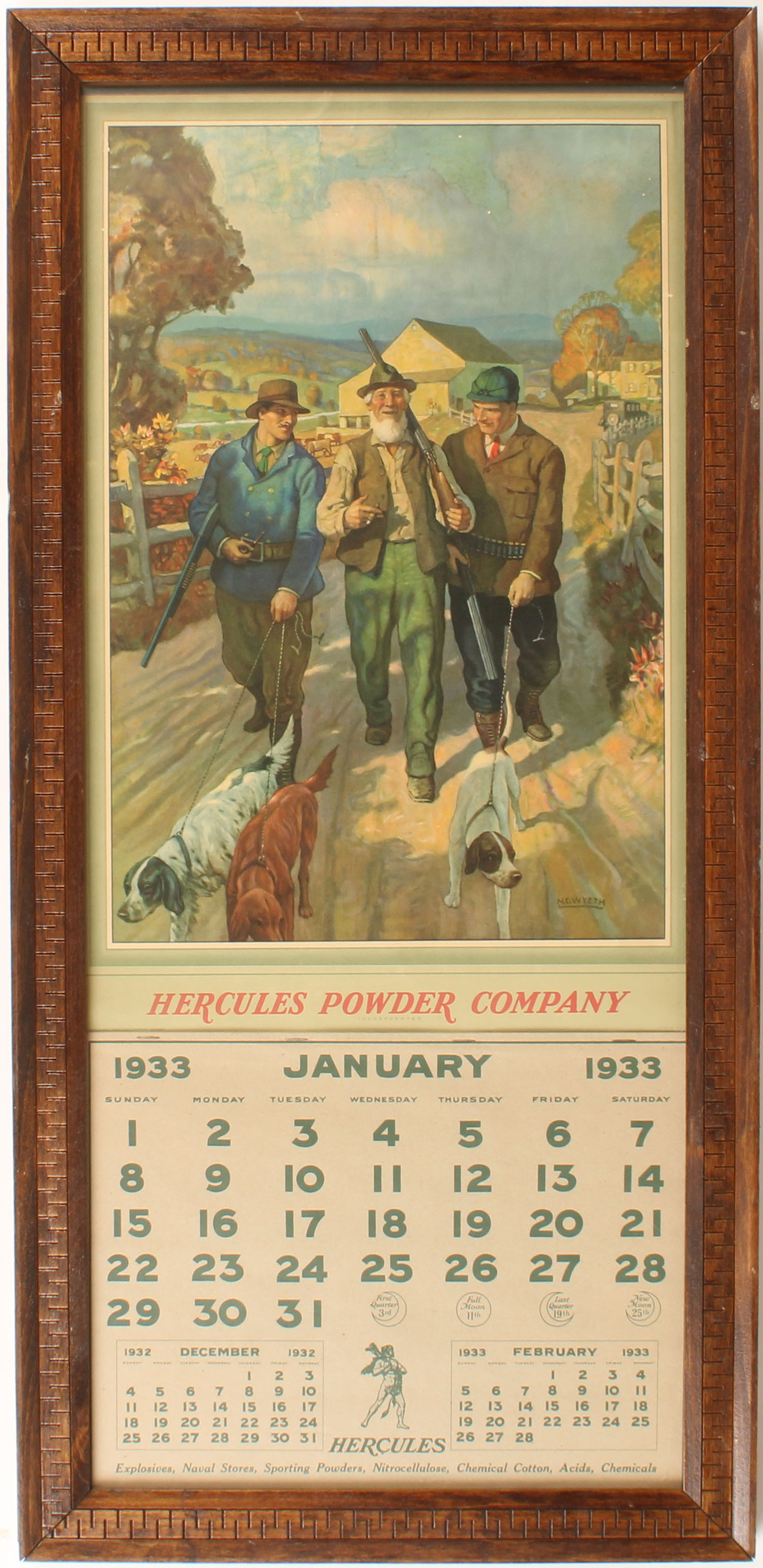 Hercules Powder Co., 1933 Calendar, 13'' x 29 3/4'', pictures three hunters walking with hunting dogs on leach by N.C Wyeth, top metal band, Full pad of pages, has great colors, near mint with almost no wear, excellent edges & colors, framed. Grade: Excellent ++ - Value: 200 to 500