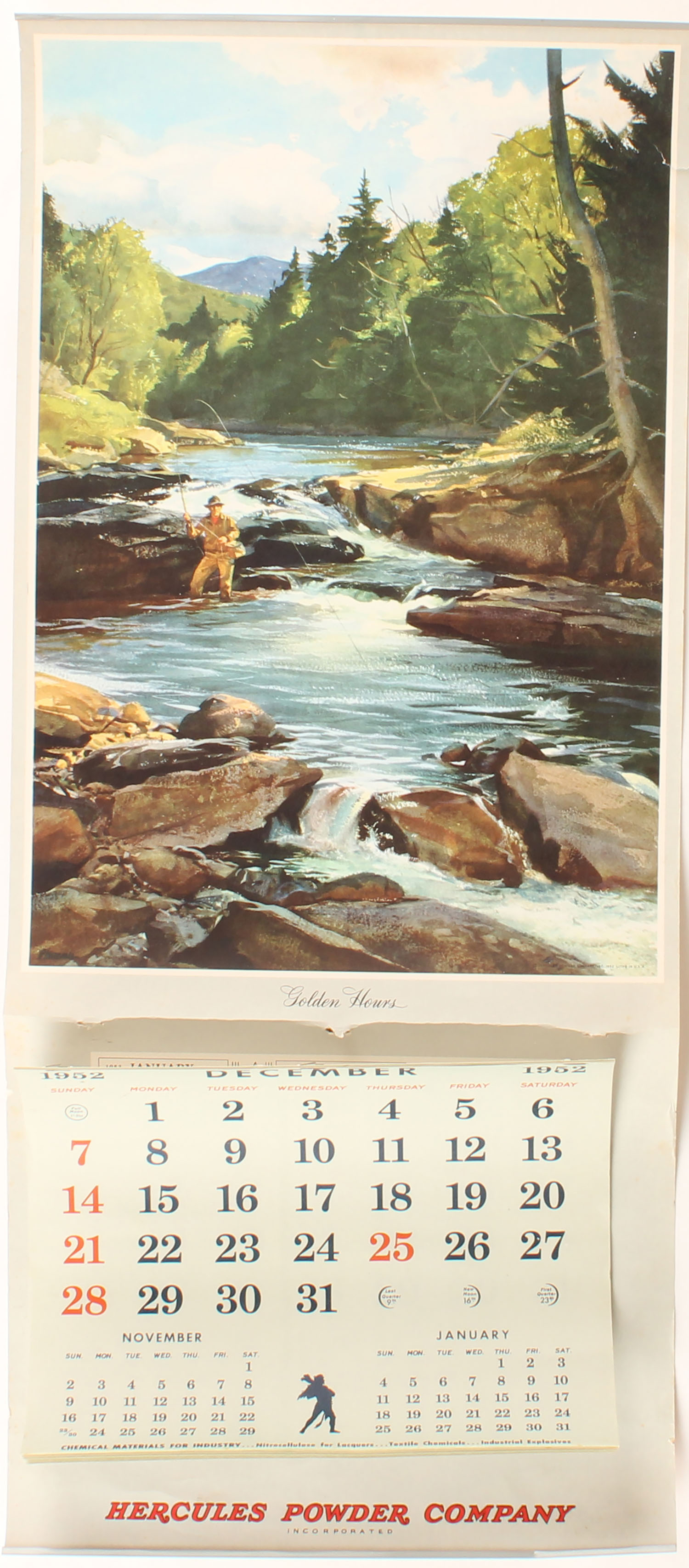 1953 Hercules Powder Co. Calendar, ''Golden Hours'', pictures gorgeous full color image fly fishing scene in river, 13'' x 30 1/2'', Full pad of pages, metal bands top & bottom with brass hanger, almost no wear, bright vivid colors. Grade: Excellent + - Value: 200 to 500