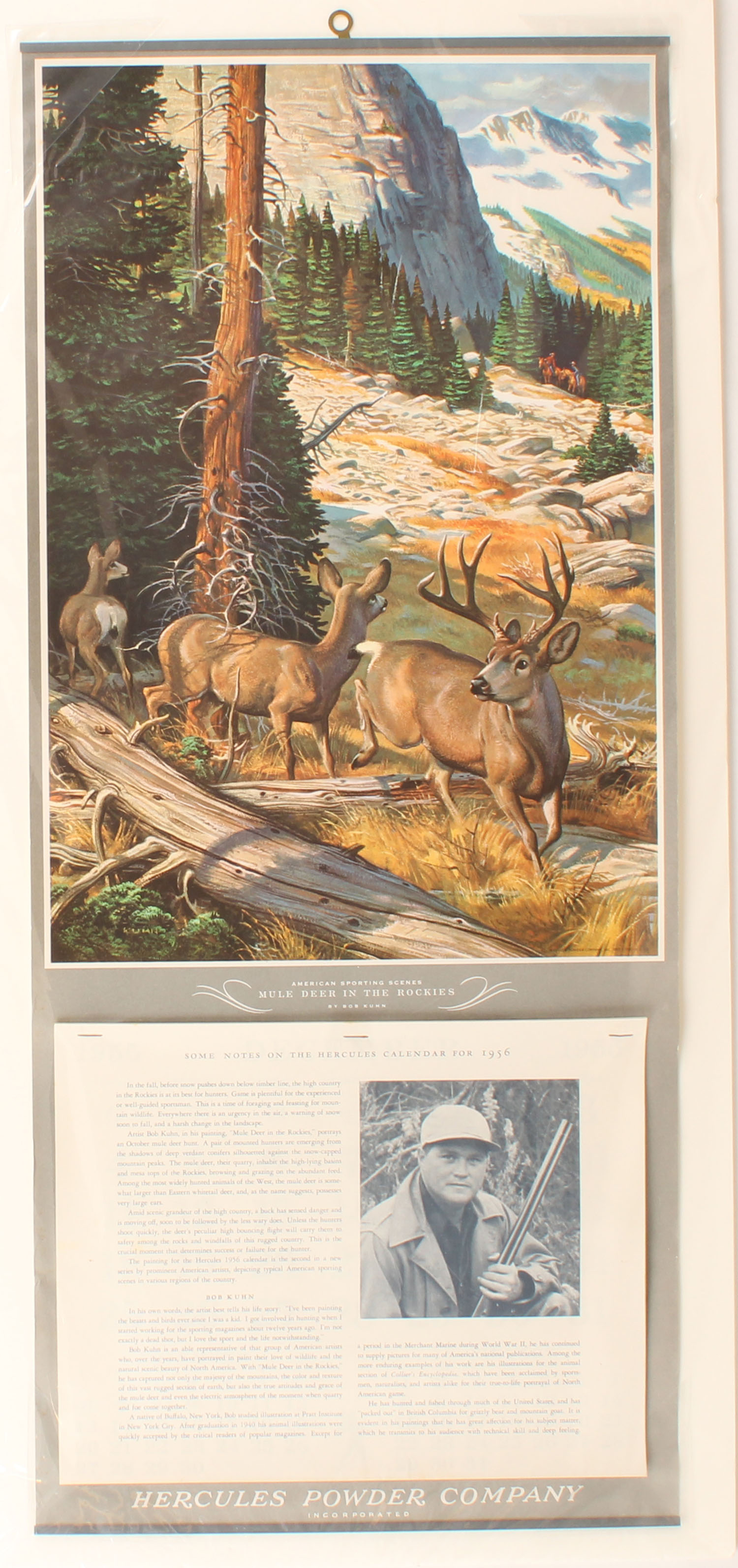 1956 Hercules Powder Co. Calendar, 13'' x 30'', pictures Mule Deer Hunting scene in the Rocky mountains, top & bottom metal bands & brass hanger, FULL PAD OF PAGES with cover page, has great colors, near mint condition with light edge wear. Grade: Excellent ++ - Value: 200 to 500
