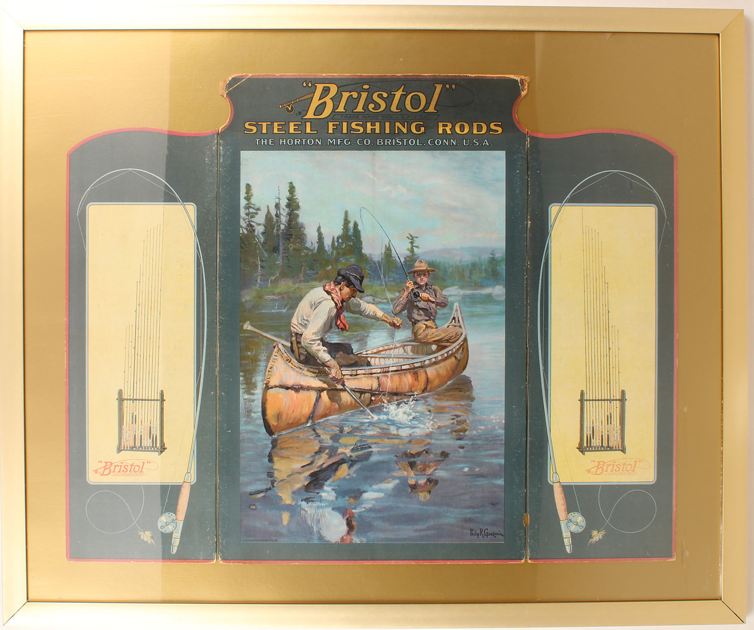 RARE Bristol Diecut pictures fisherman landing a fish in a birch canoe, both side panels advertise for rods, shows edge wear to top with nice colors, 33 1/2'' 27'', framed, Very Hard to find Bristol Diecuts. Grade: Very Good ++ - Value: 2000 to 5000