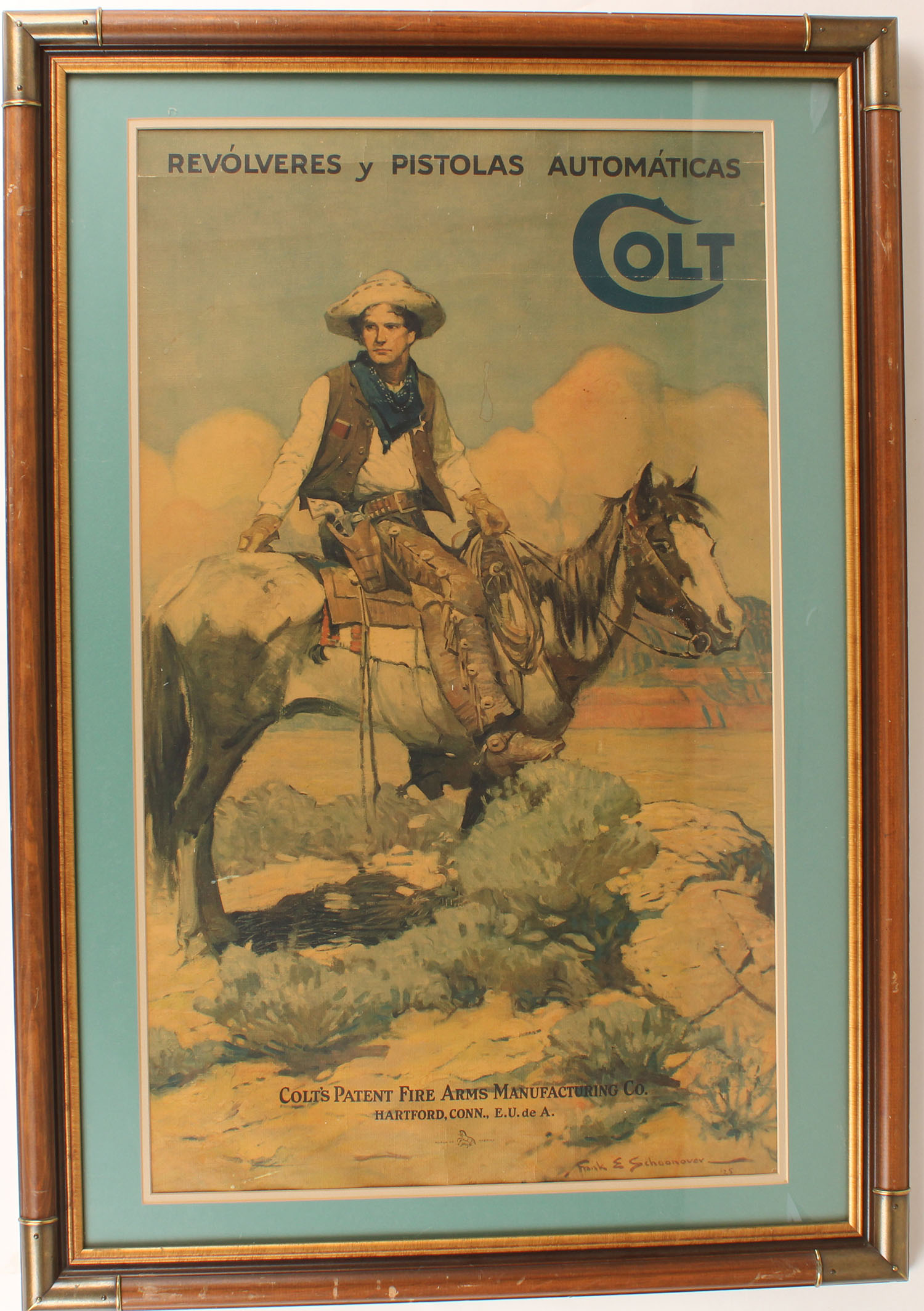 Colt Poster ''TEX AND PATCHES'' Spanish variation, by artist Frank Schoonover, pictured in Strauss book variation number four, has advertisement on bottom, has metal bands and brass hanger, 20'' x 33'', shows light age soiling otherwise very nice, no roll wrinkles, framed. Grade: Very Good ++ - Value: 1000 to 2000