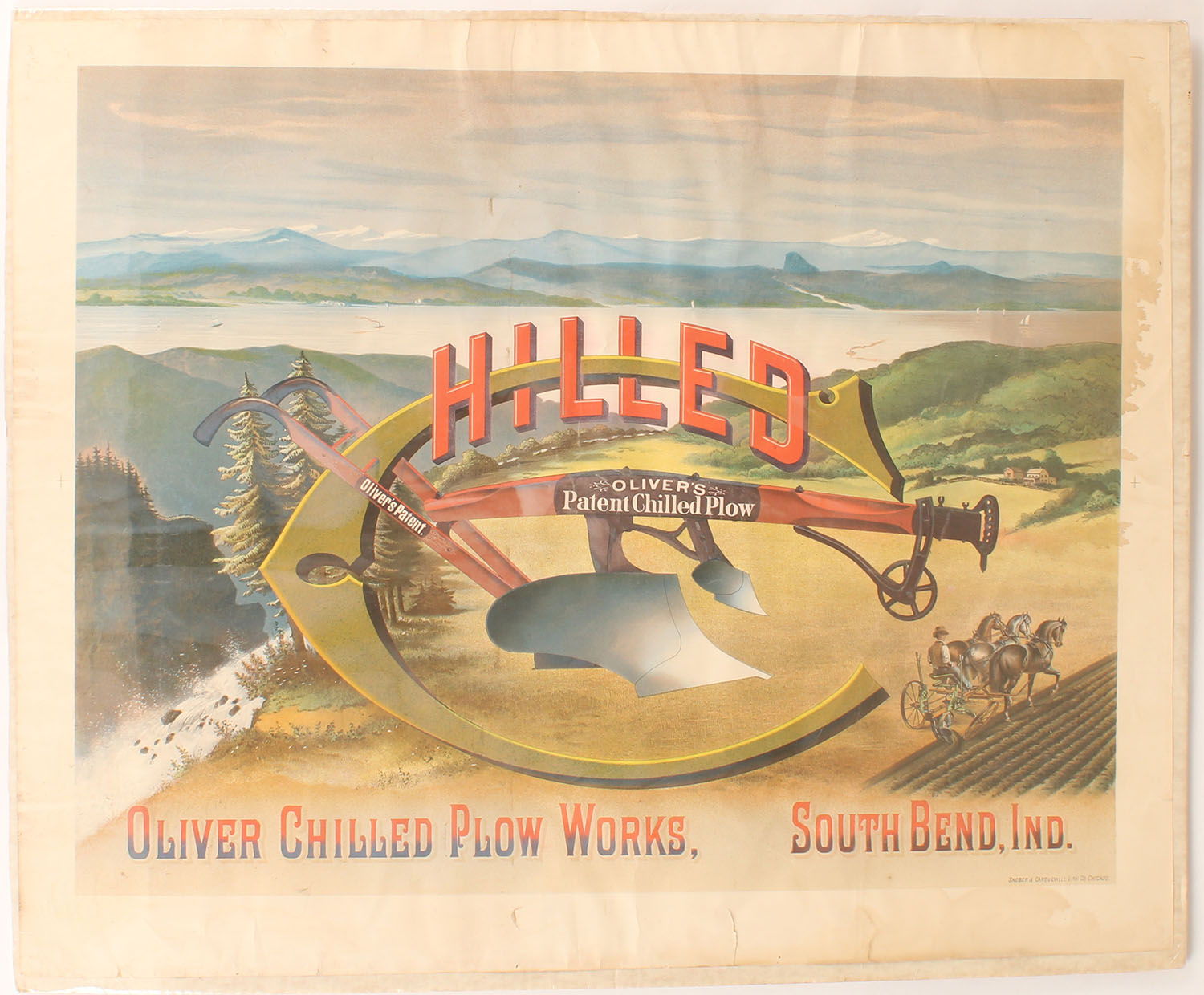 Oliver Chilled Plow Works, South Bend, Ind. Poster, pictures an early plow over looing a farm filed & lake, 27'' x 21'', shows some edge stains that would not be seen when framed. Grade: Excellent - Value: 100 to 500