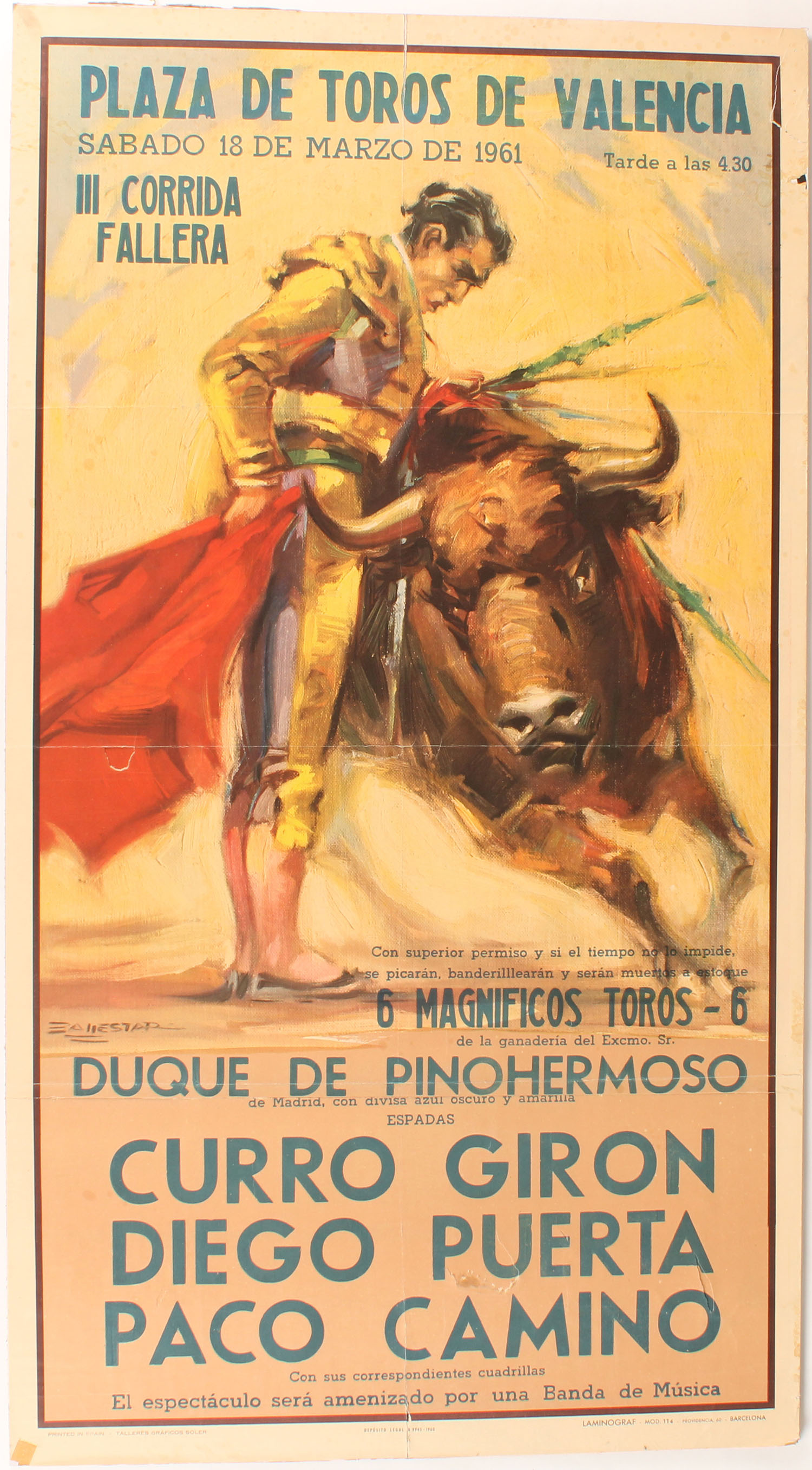 Spanish Bull Fighting Poster pictures matador fighting a bull in action, 21'' x 38'', mounted on board, has a few tears, printed in Spain. Grade: Very Good - Value: 30 to 250