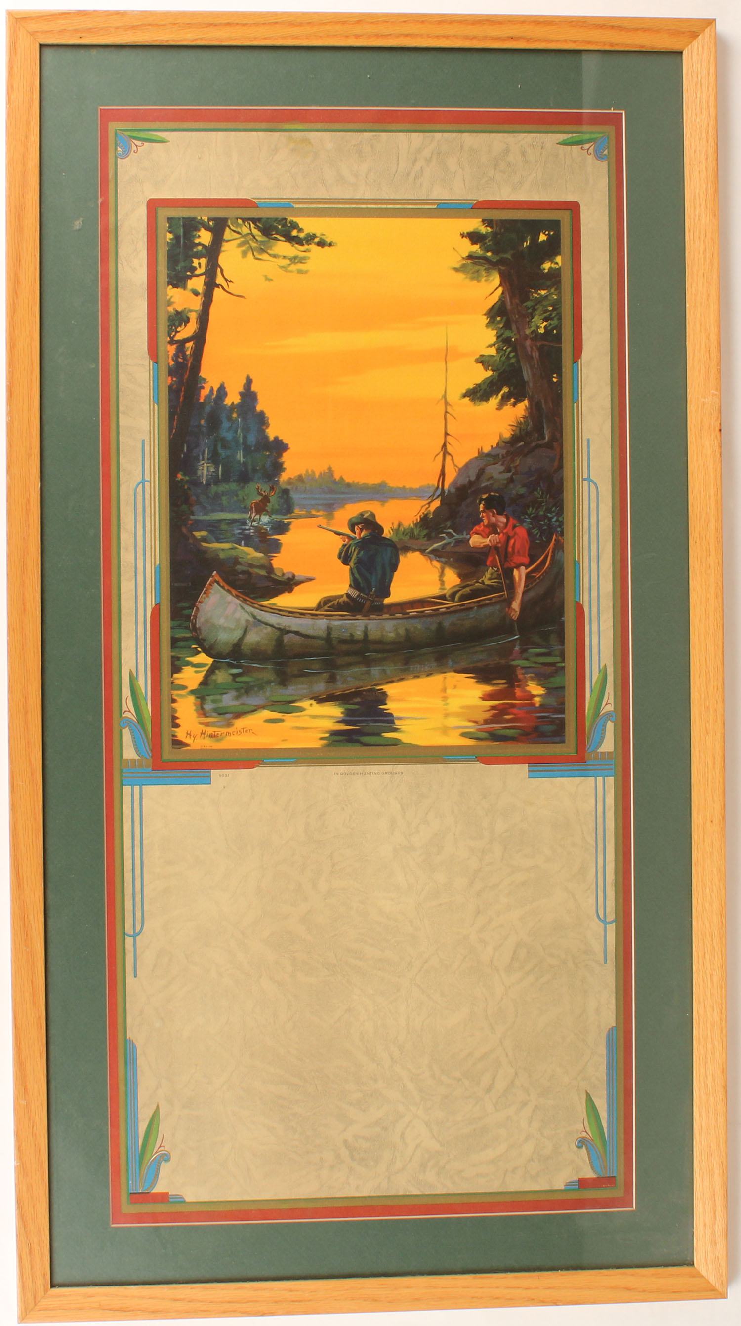Hy Hintermeister calendar, IN GOLDEN HINTING GROUNDS, salesman sample, pictures two hunters shooing at a bull moose out of a birch canoe, no pages or bands, 16'' x 33 1/2'', framed & matted. Grade: Mint - Value: 20 to 100