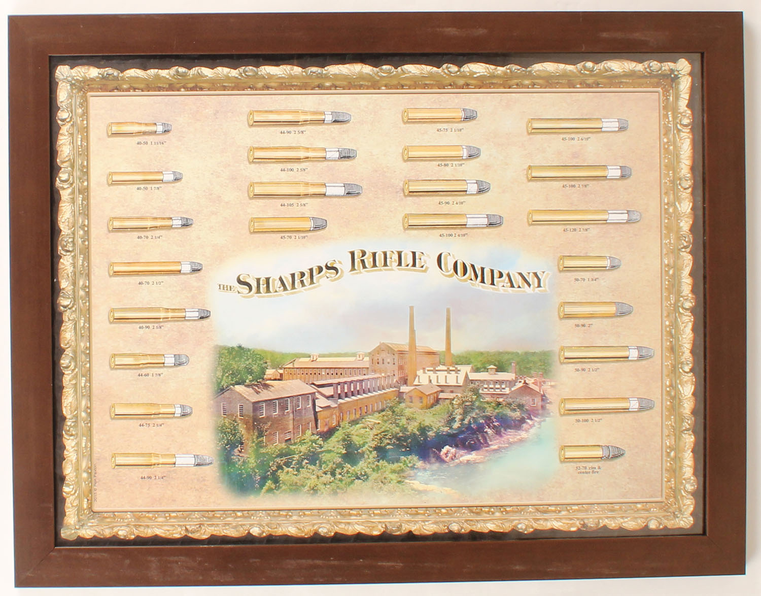 Sharps Rifle Co Poster, has beautiful colors of factory on rivers edge & many cartridges, 23'' x 17'', framed. Grade: Excellent - Value: 100 to 300