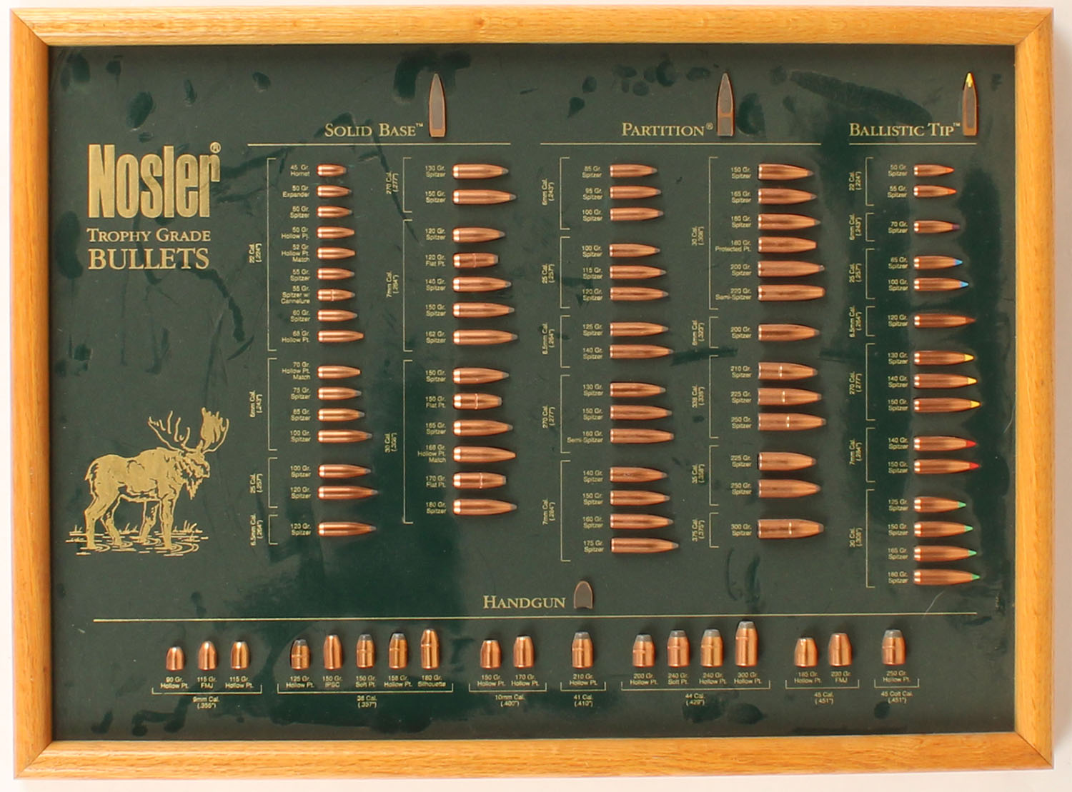 Nosler Trophy Grade Bullet Board, pictures bull moose, all bullets intact, 21'' wide. Grade: Excellent + - Value: 100 to 300