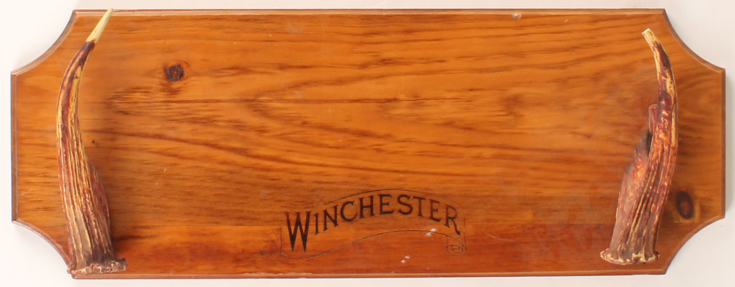 Winchester gun rack with elk antlers, 24'' wide. Grade: Excellent + - Value: 30 to 200