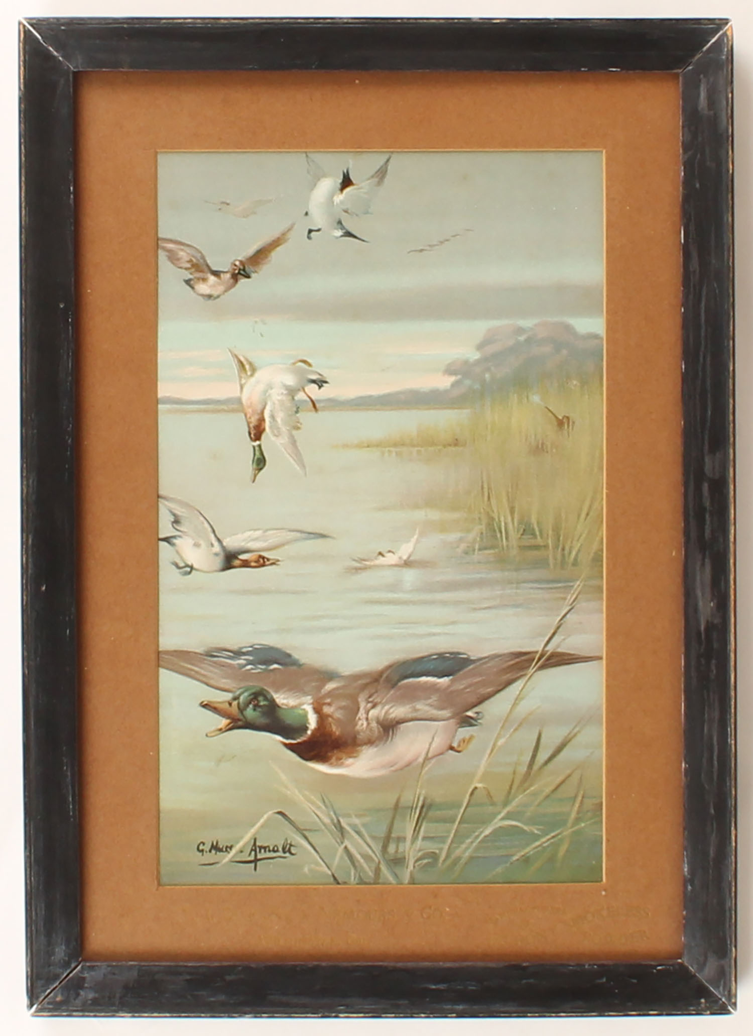 Rare Shotshell wood create insert by G. Muss Arnolt, pictures hunter in background shooting at mallards, has rare E.I. Dupont de Nemours & Co gold lettering at bottom of matting, framed, 8'' x 13'' image size. Grade: Excellent + - Value: 100 to 500