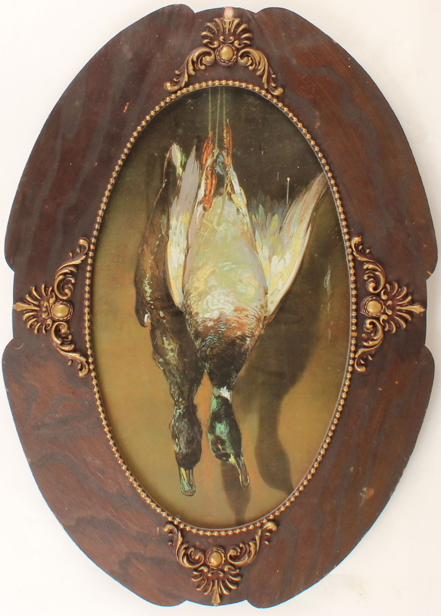Early hanging mallard print by unknown artist in oval frame, 11 /2'' x 19 1/2'' image size. Grade: Excellent - Value: 50 to 500