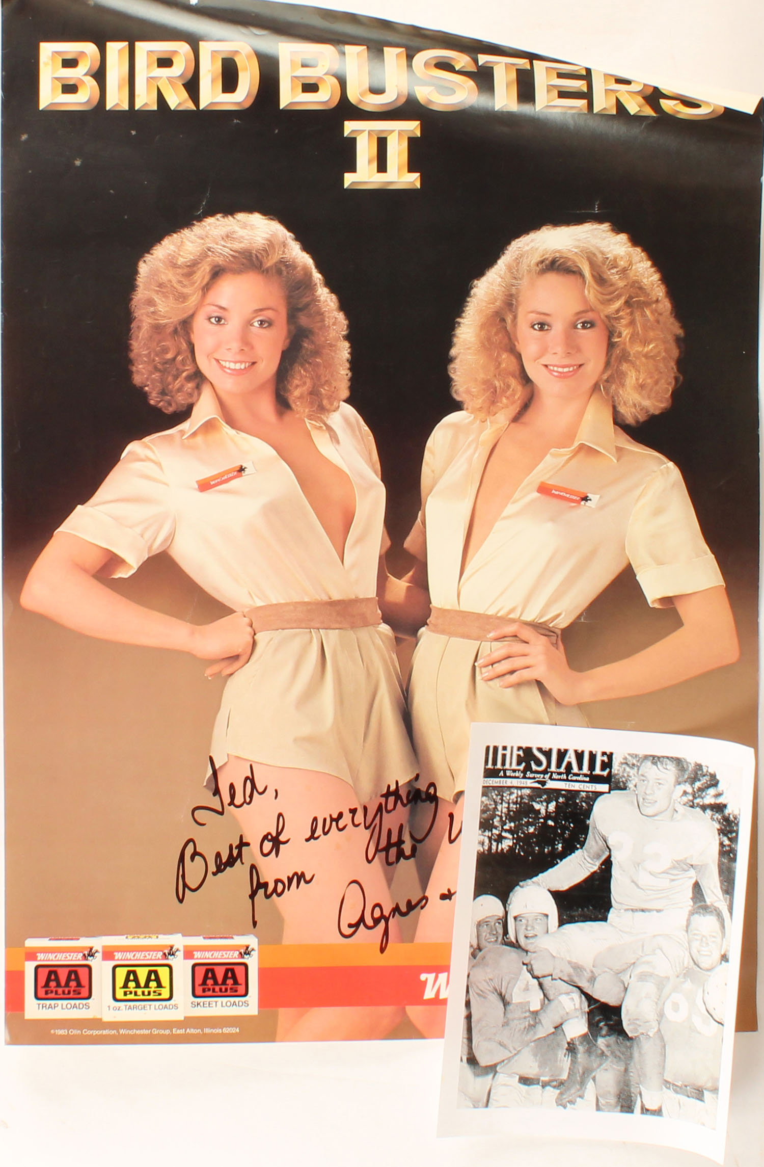 Winchester BIRD BUSTER II AA PLUS Poster, pictures the Winchester Twins, this one is rare as it is signed by the twins to Ted Hazelwood A pro football player for the Washington Redskins in 1953 also played for U of NC, included is a photo of him in a football uniform at U of NC, 20'' x 28''. Grade: Excellent + - Value: 100 to 500